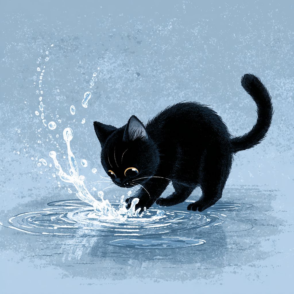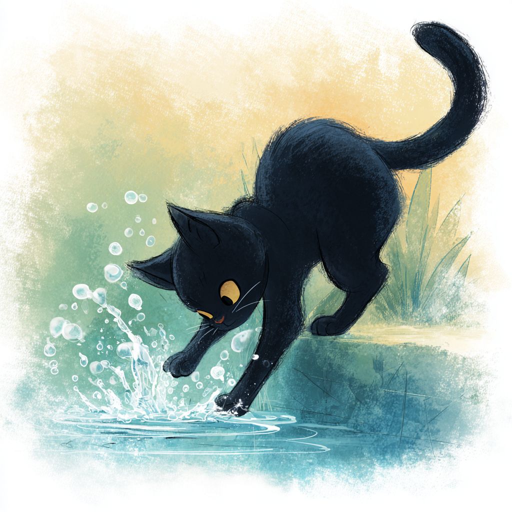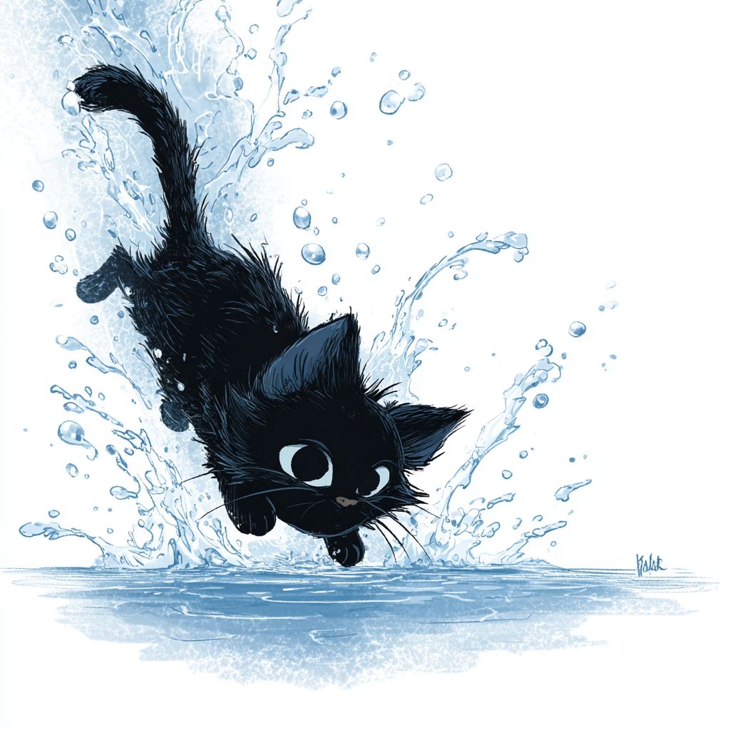 A small black cat lowered its head to explore the water and played with its front and side, and its entire body. One paw reached out to take a splash of water, head down, Disney cartoon style.