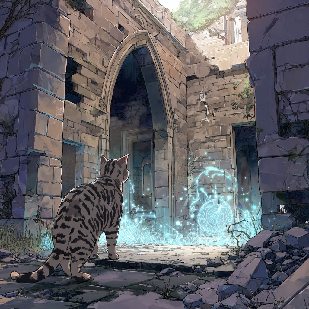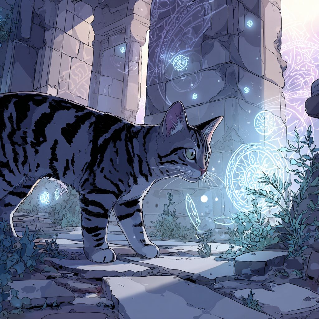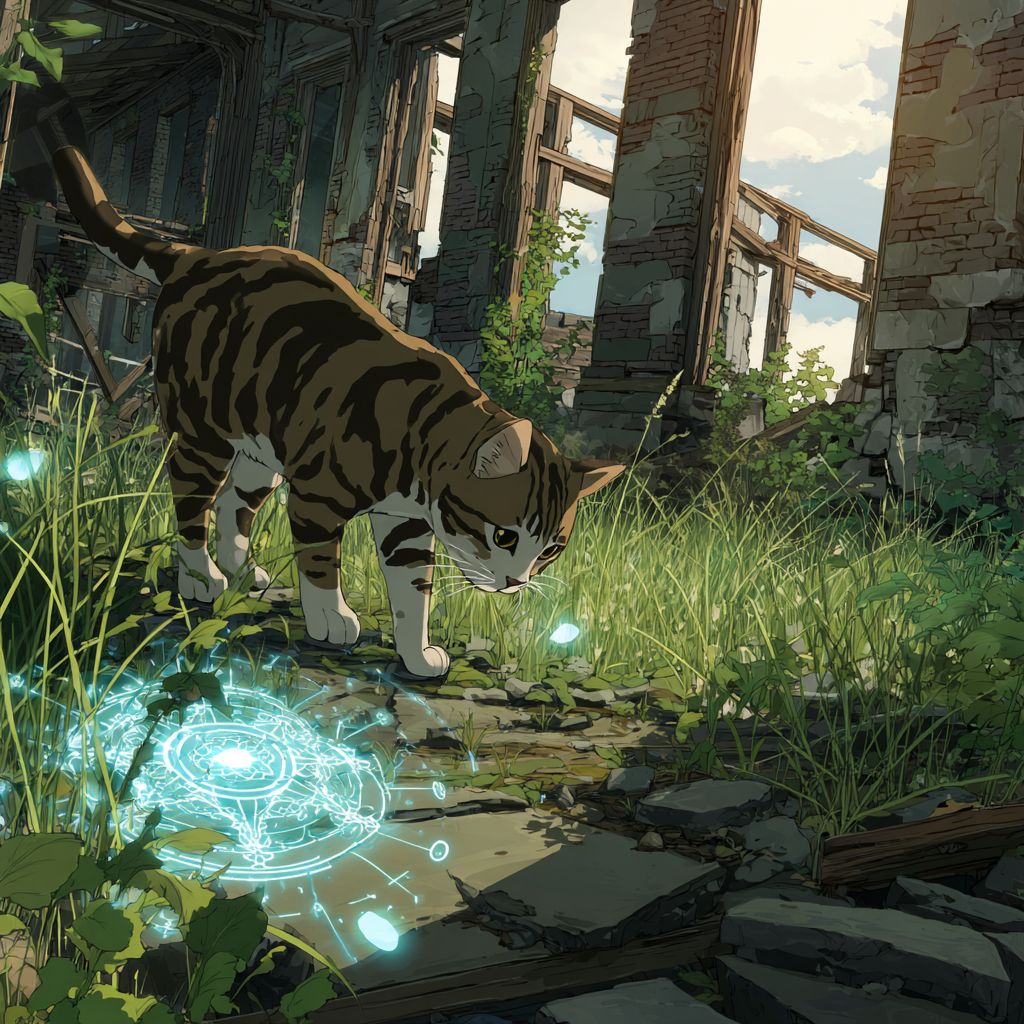 A tabby cat exploring the ruins of a haunted abandoned mansion, in a sports anime style like Haikyuu, with glowing auras, intricate patterns, and a soft ethereal glow.