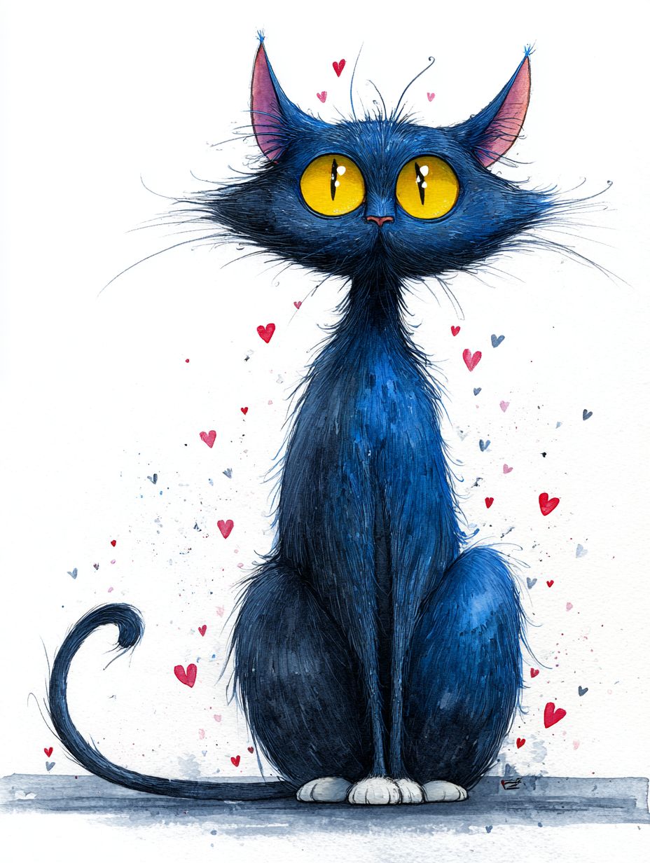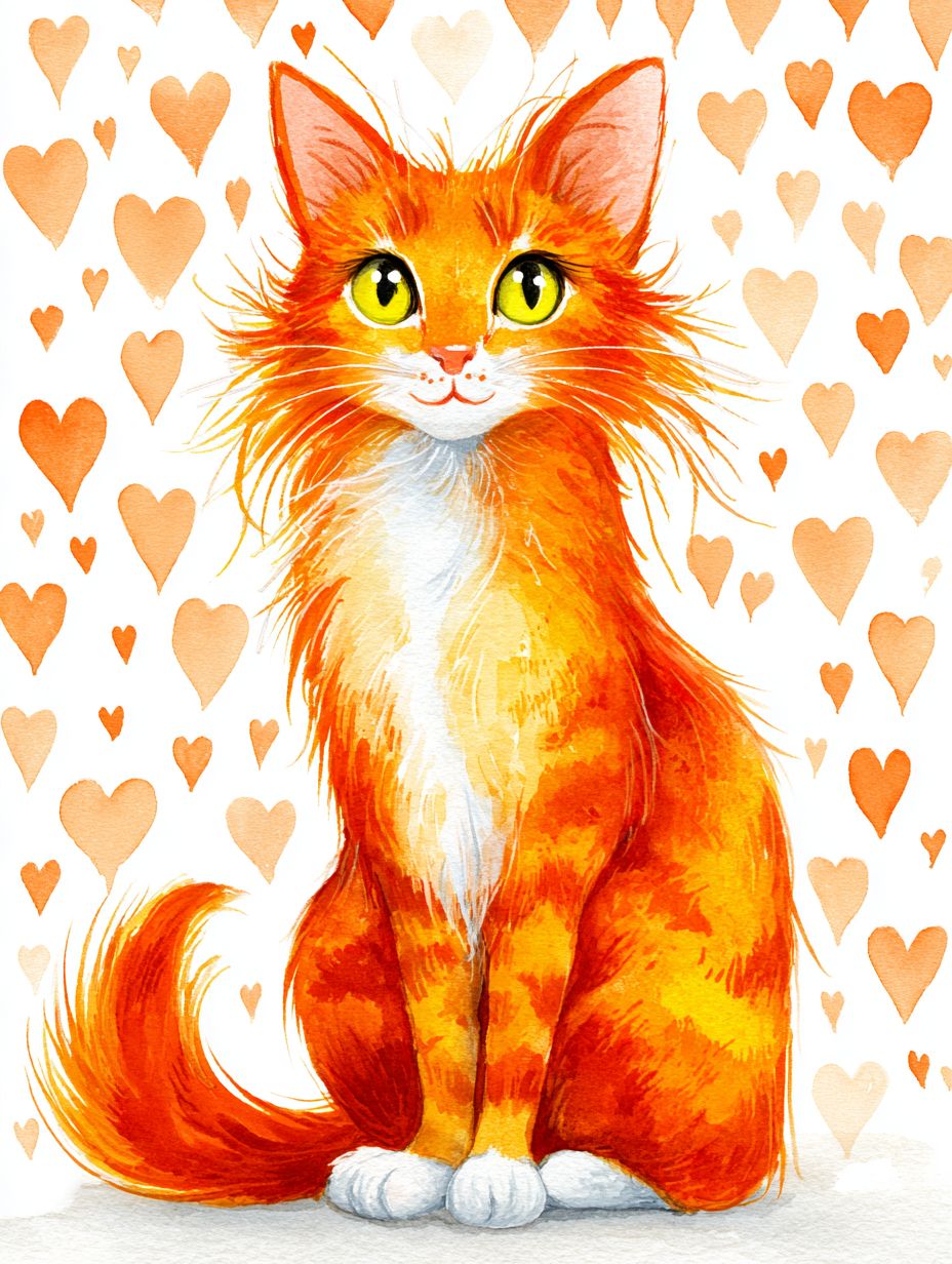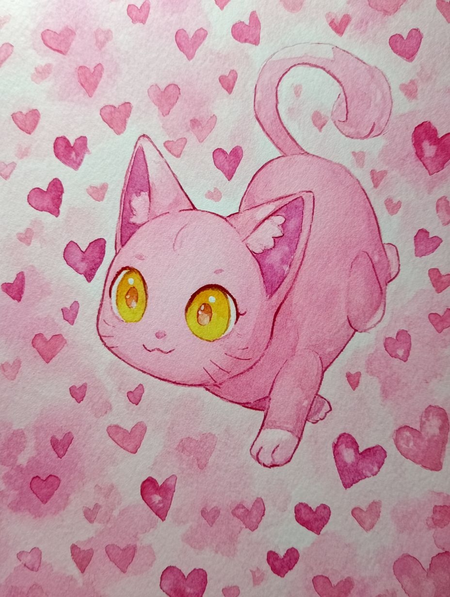 Bright, vivid, and lively hues. Watercolor painting. Masterfully rendered. A charming and whimsical cartoon cat drawn with delicate lines (round head, yellow eyes, pink ears, curled tail, white paws), its fur as fine and long as noodles, floating in the air. The background features 100 small hearts, clean and crisp.