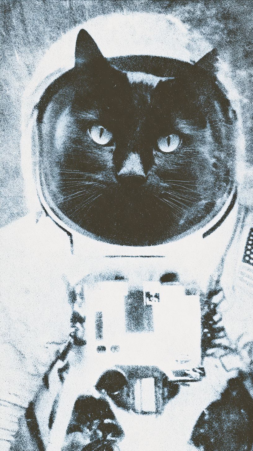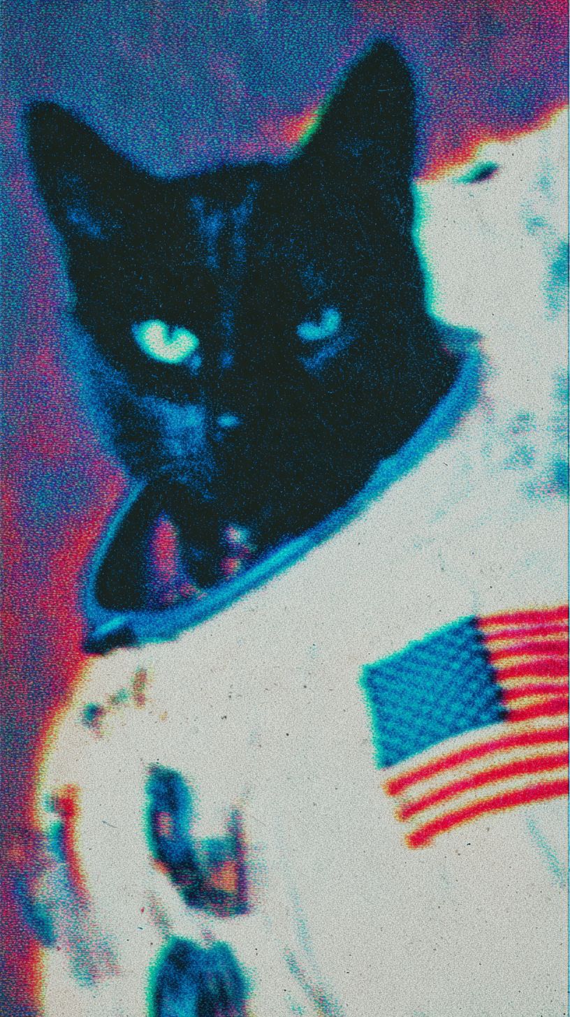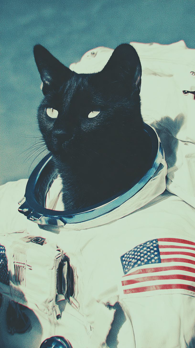 A close-up of a black cat in an astronaut suit with a US flag. The image resembles a 2000s magazine photo with a grainy film effect.