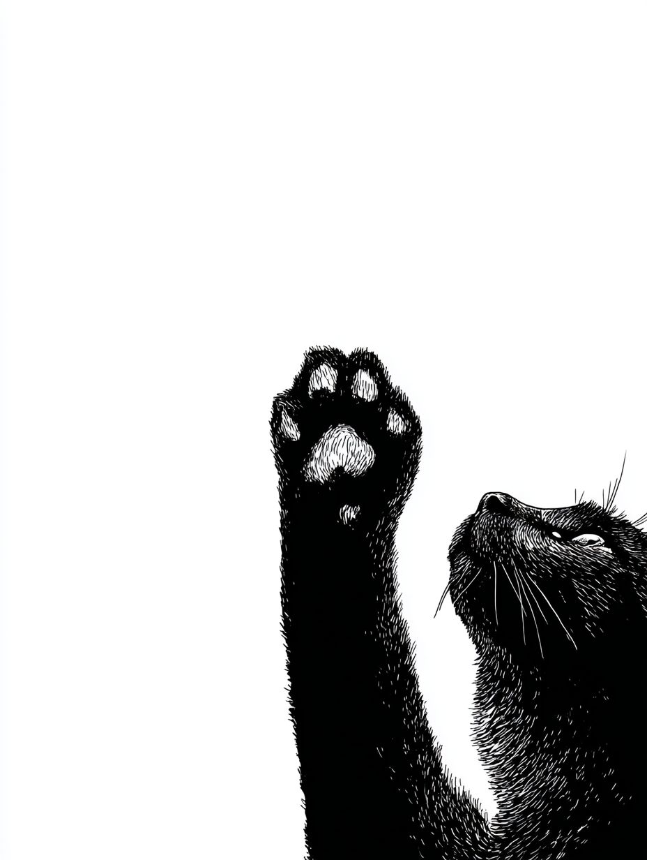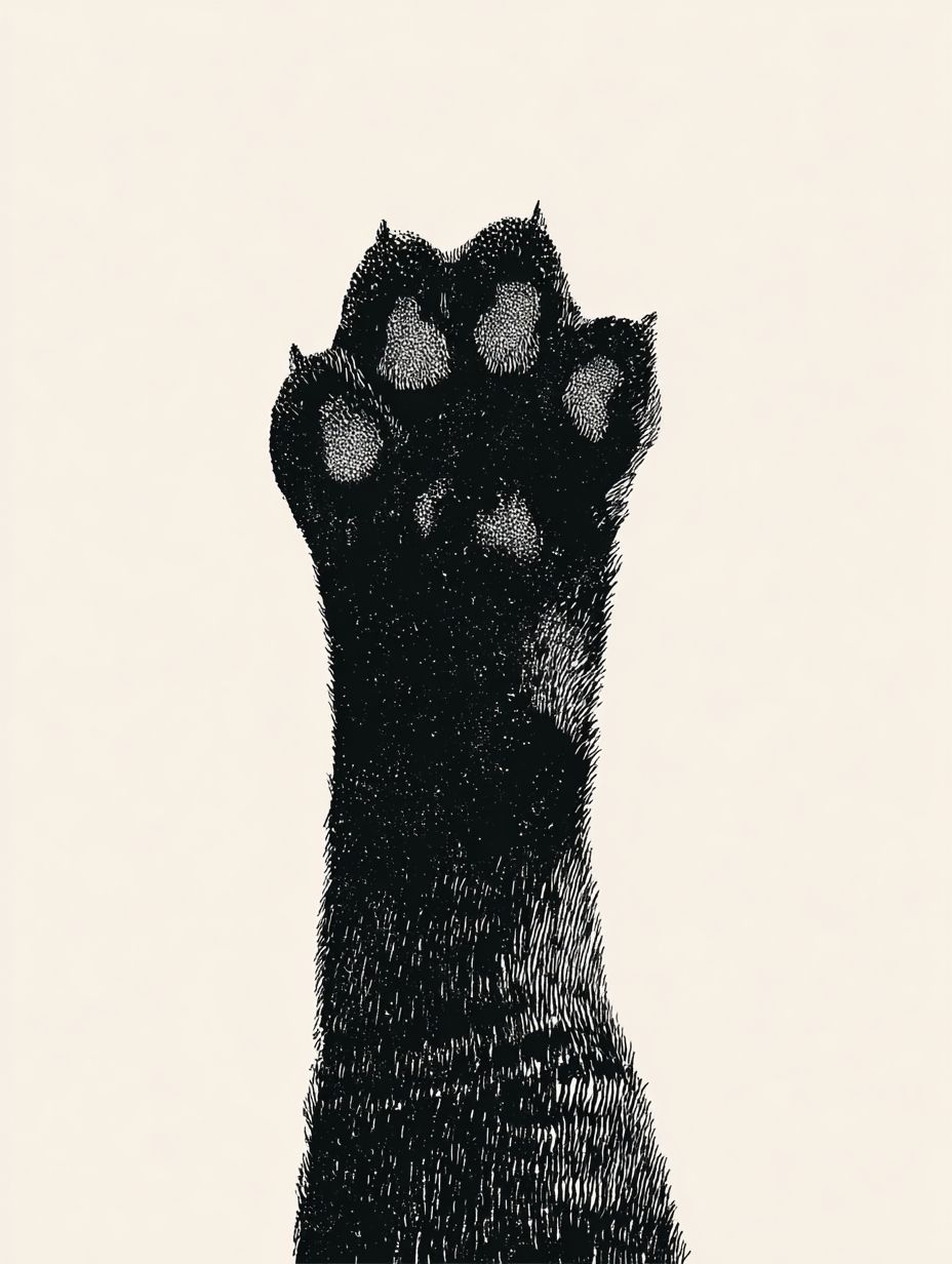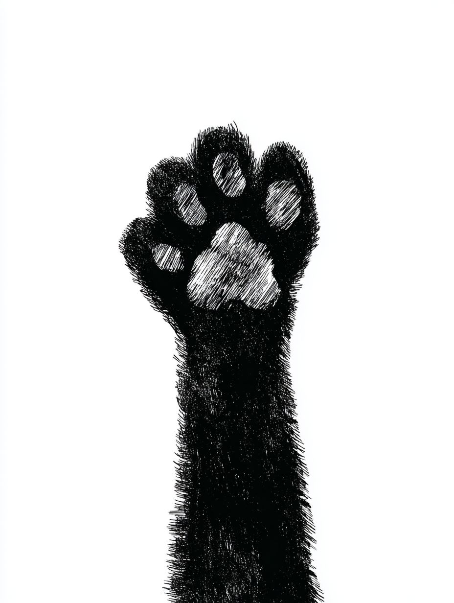 Minimalist black and white illustration of a raised black cat's paw