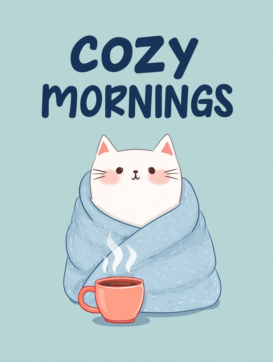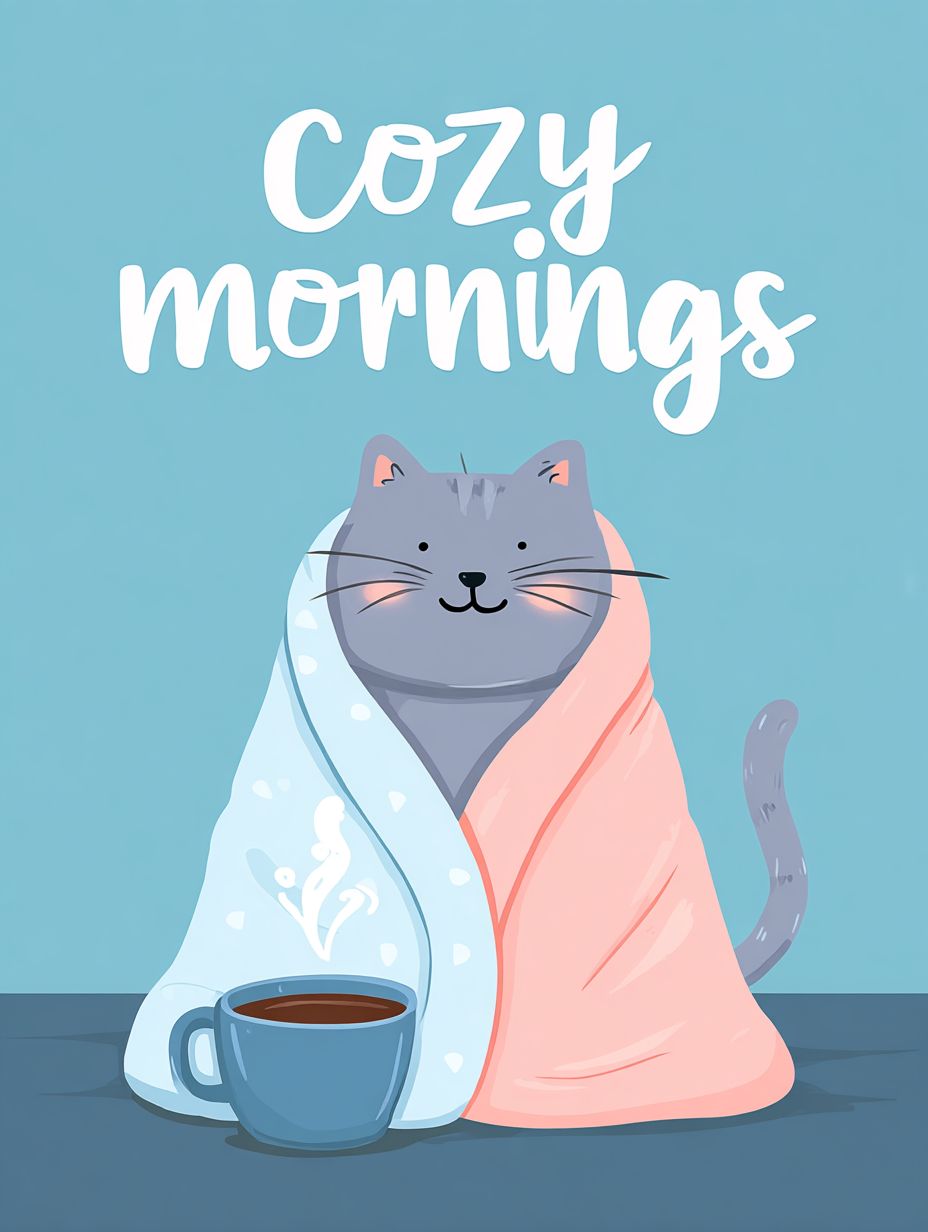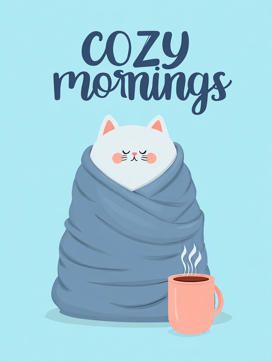 A cute cartoon cat wrapped in a blanket, a cup of hot coffee nearby, and the text 'cozy mornings' above on a blue background. Vector illustration for print or t-shirt design, isolated on a pastel background.