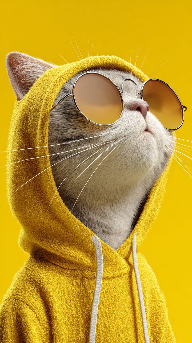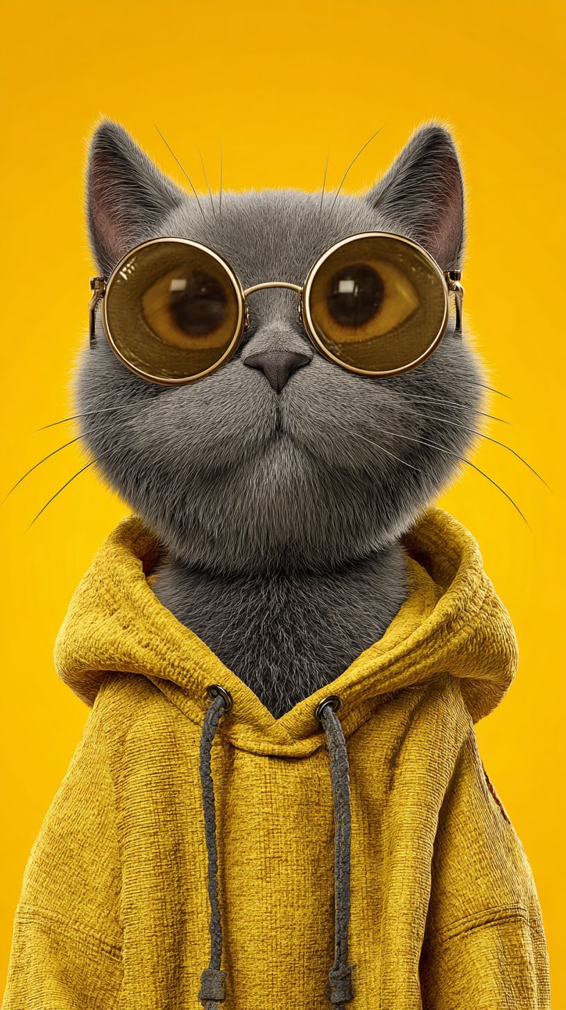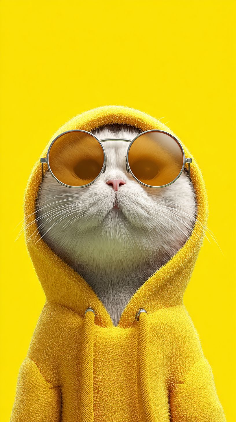 قطة ترتدي نظارات طيار وبلوزة مع غطاء، على خلفية صفراء نقية، بأسلوب ملصق فيلم. مثالية كخلفية لهاتفك. تصميم بسيط على طراز بيكسار، جودة HD، خلفية صفراء زاهية. نمط بيكسار، نمط كارتوني، عرض ثلاثي الأبعاد، عرض أوكتان، بلندر، الحد الأدنى.