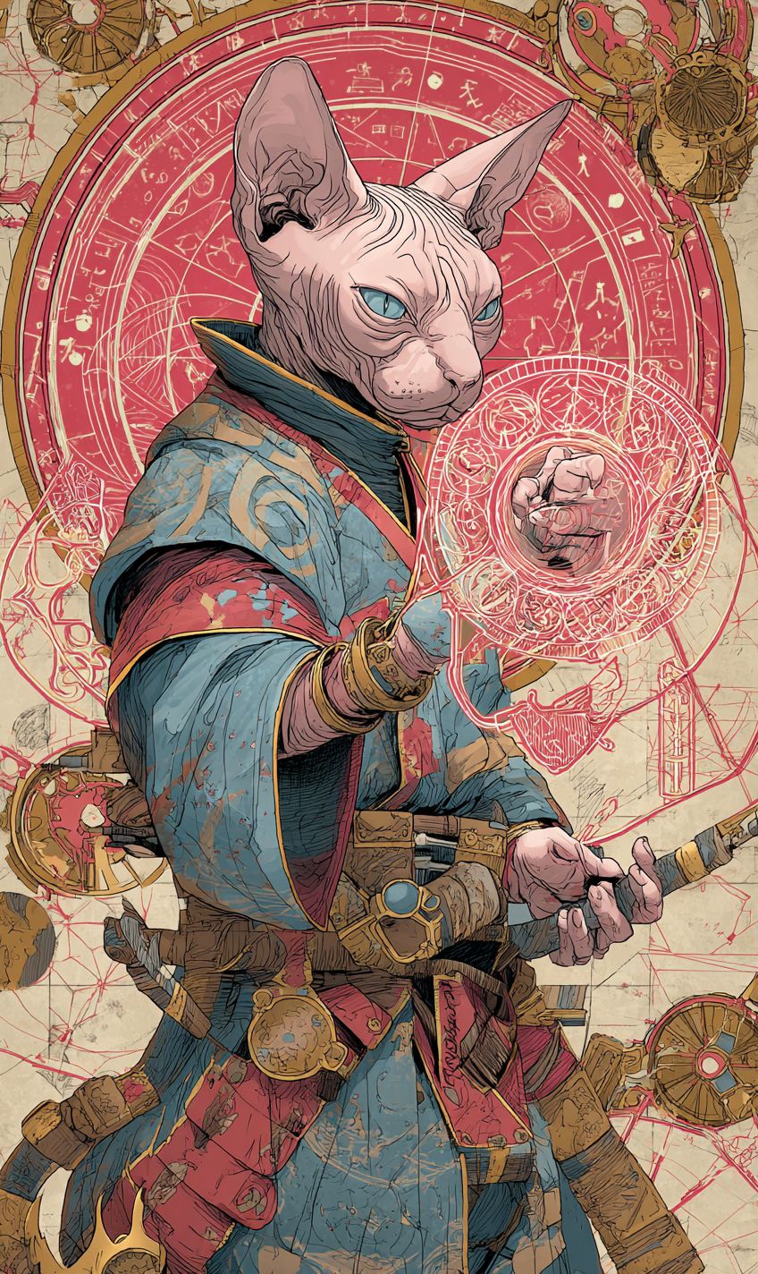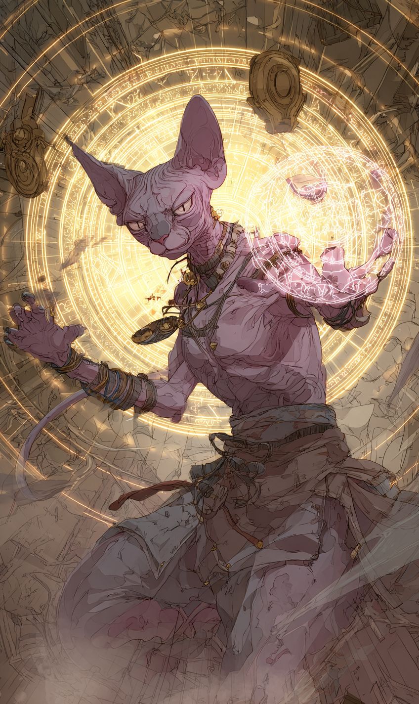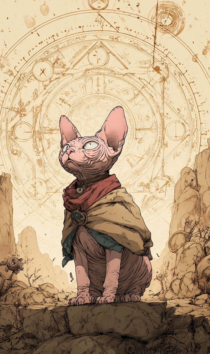 قطة سفينكس تلقي التعويذات في ساحة معركة قديمة للسماوار، بأسلوب أنمي رومانسي مثل 'كذبتك في أبريل'، مع دوائر التحويل، عناصر البخار، آثار غامضة، وروح مغامرة.