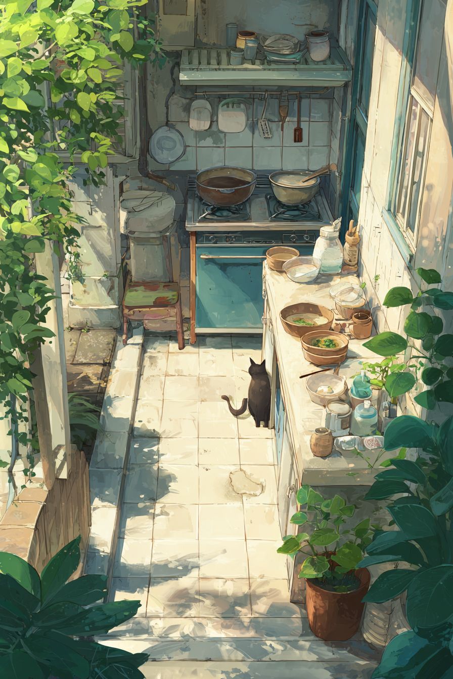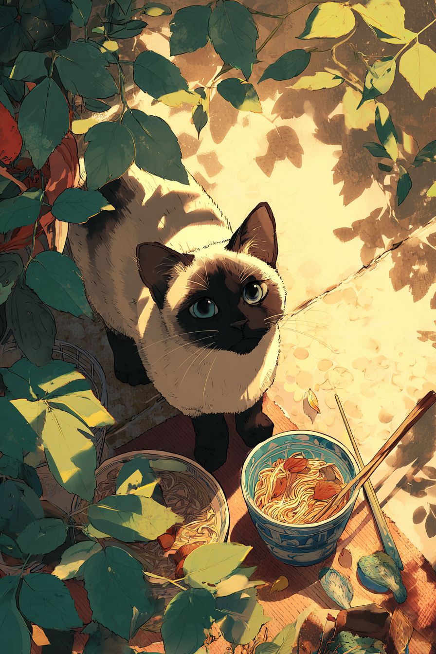 قط سيامي أنيق يطبخ الرامين في ملعب كرة الطائرة الرومانسي، بأسلوب أنمي مثل 'كذبتك في أبريل'، معTextures مائية ناعمة وتفاصيل غريبة، وضوء الشمس الدافئ يتسلل من خلال الأوراق