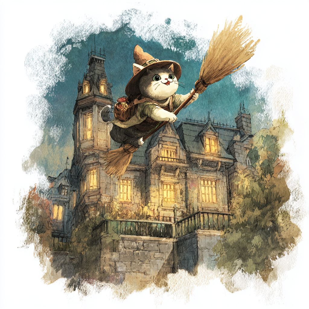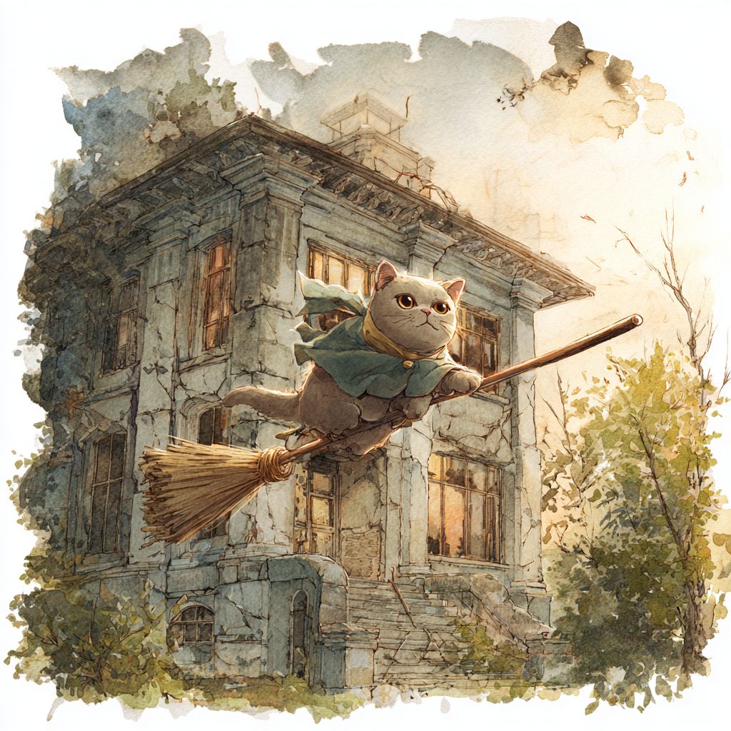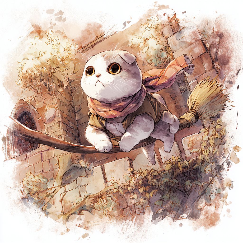 قط سكتلندي مطوي يركب مكنسة في قصر مهجور مسكون، بأسلوب رعب أنيمي مثل طوكيو غول، قوام مائي ناعم، تفاصيل غريبة، ضوء الشمس الدافئ يتسلل من خلال الأوراق، تفاصيل عالية، ألوان زاهية.