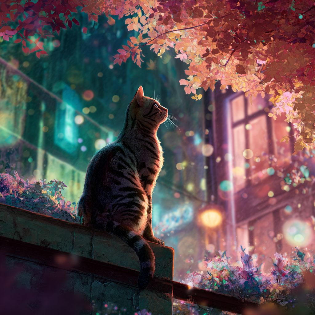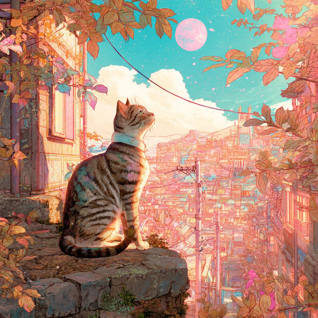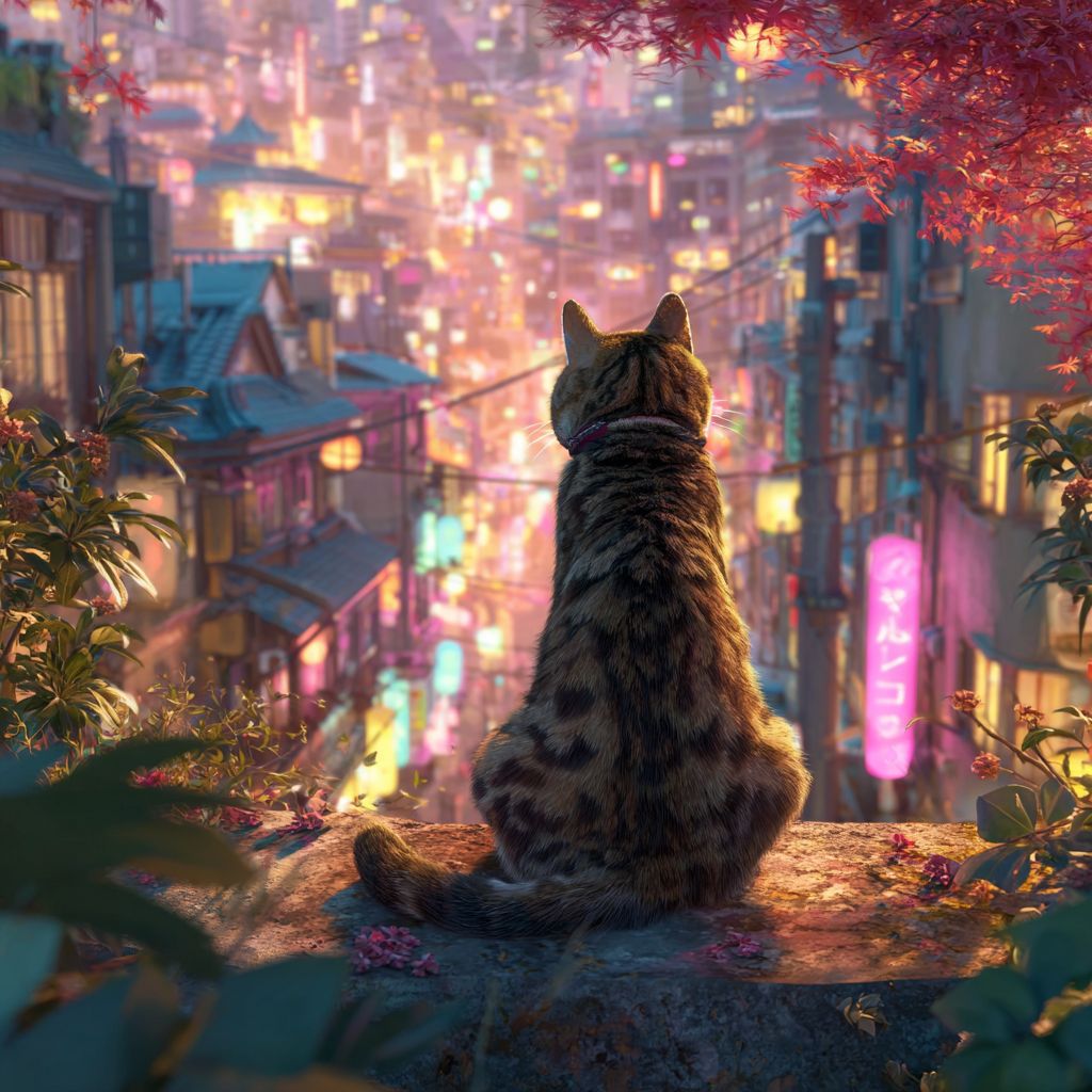 قط يشير إلى طراز الرسوم المتحركة للفتاة السحرية مثل Sailor Moon، مع تفاصيل غريبة، وأشعة شمس دافئة تتخلل من خلال الأوراق، مضاءً بأضواء النيون في شارع مدينة ممطر، بدقة عالية، وألوان نابضة بالحياة.