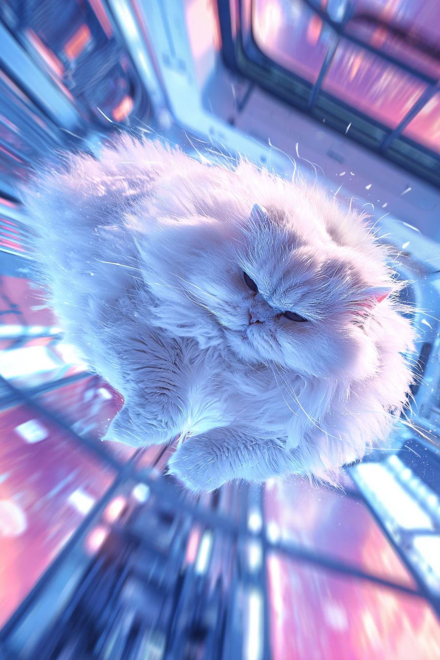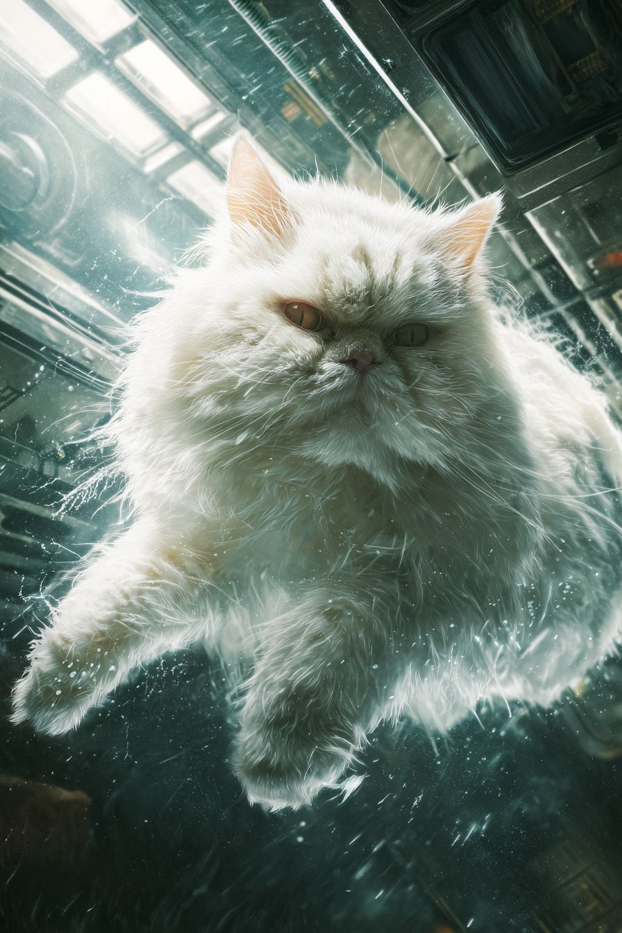 قطة فارسية تسترخي وتطفو في محطة فضائية في حالة انعدام الوزن، وضع عمل أنيمي درامي مستوحى من ناروتو، قطرات عرق، وجوه مصممة، ضبابية حركة ديناميكية، أجواء مليئة بالطاقة.