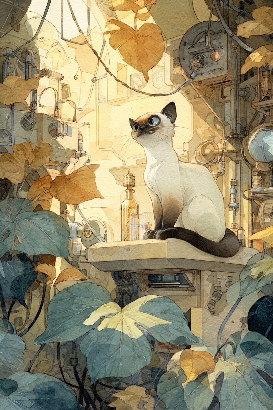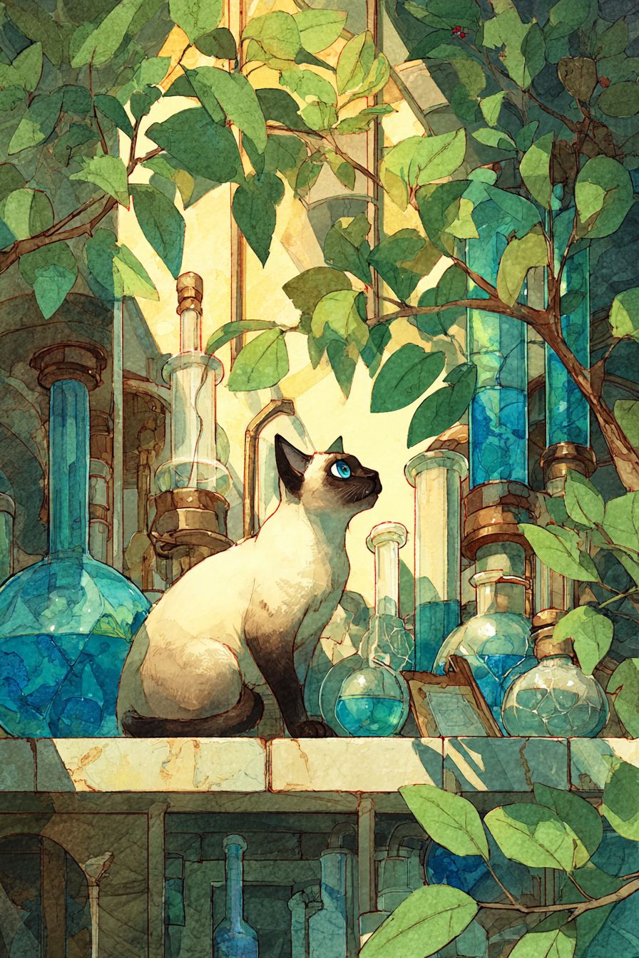 قطة سياميس أنيقة تخترق أنظمة مختبر الكيمياء، بأسلوب أنمي فانتازيا مثل الكيميائي المعدني، قوام مائي ناعم، تفاصيل غريبة، ضوء الشمس الدافئ يتخلل من خلال الأوراق، تفاصيل عالية، ألوان زاهية.
