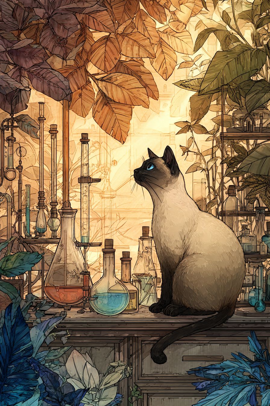 قط سيامي أنيق يقرصن مختبر الكيمياء