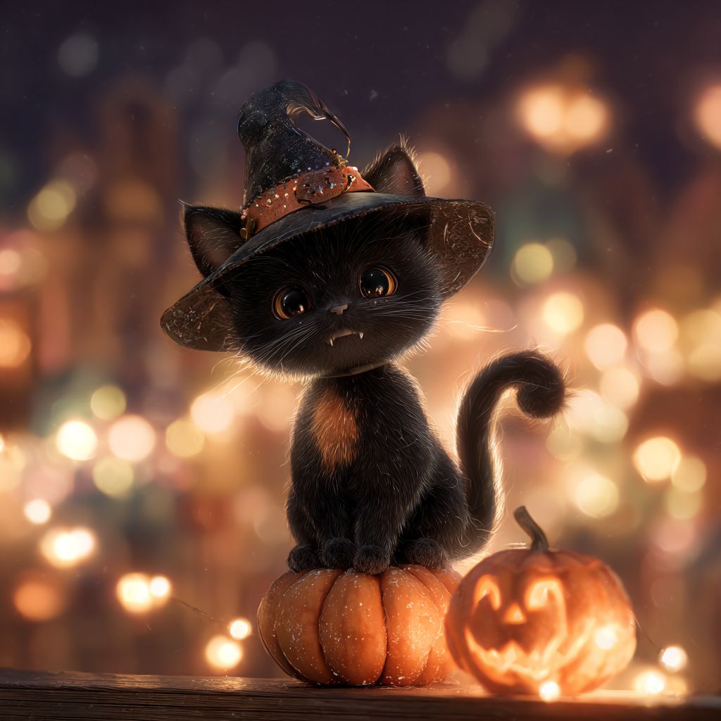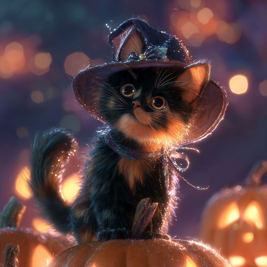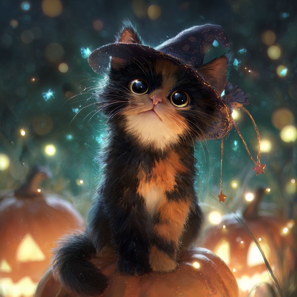 قطة أنمي adorable بفرو أسود وبرتقالي، وعيون كهرمانية متلألئة، ترتدي قبعة ساحرة مصغرة، جالسة على قرع، ليلة هالوين غامضة مع مصابيح جاك أو لانتيرن المتألقة.