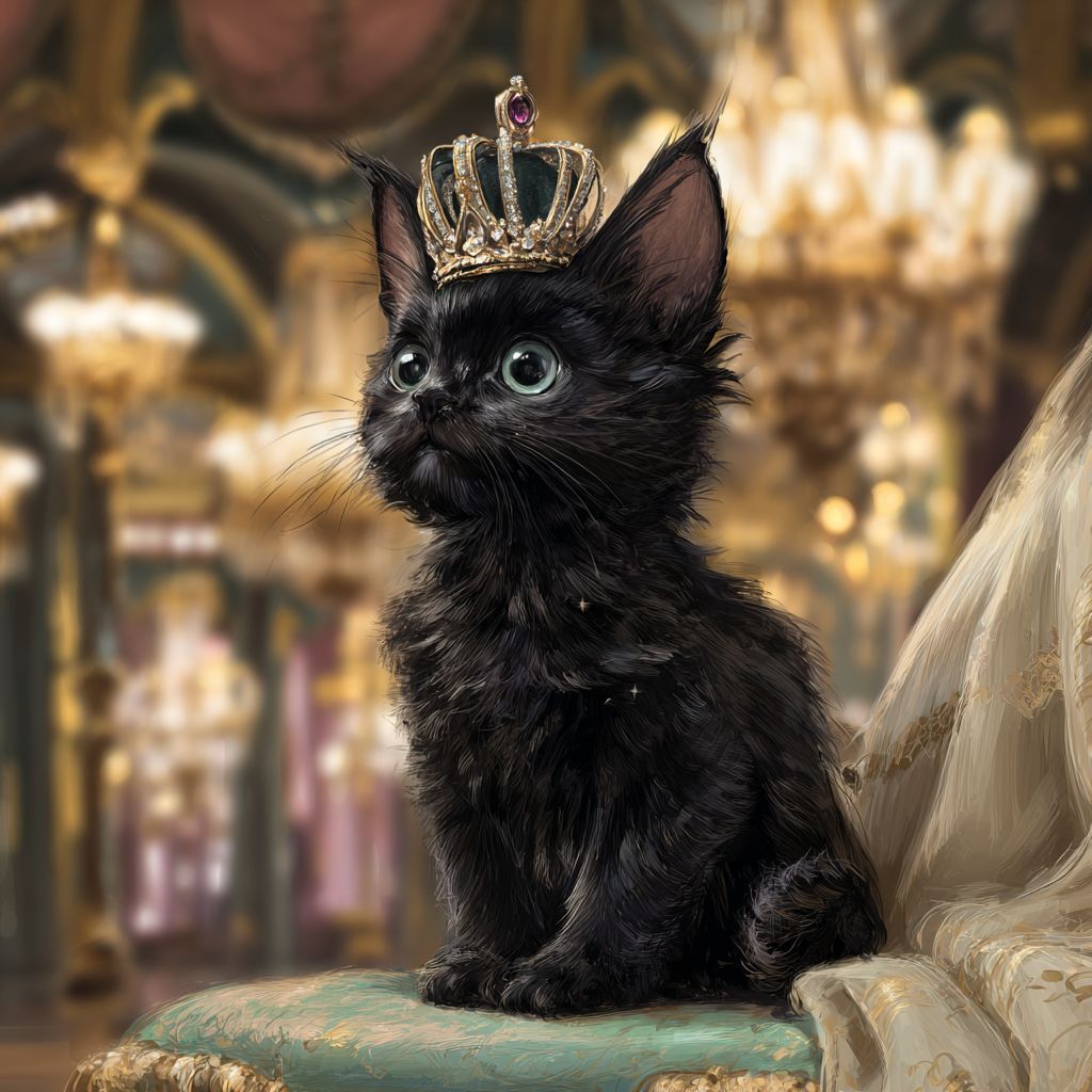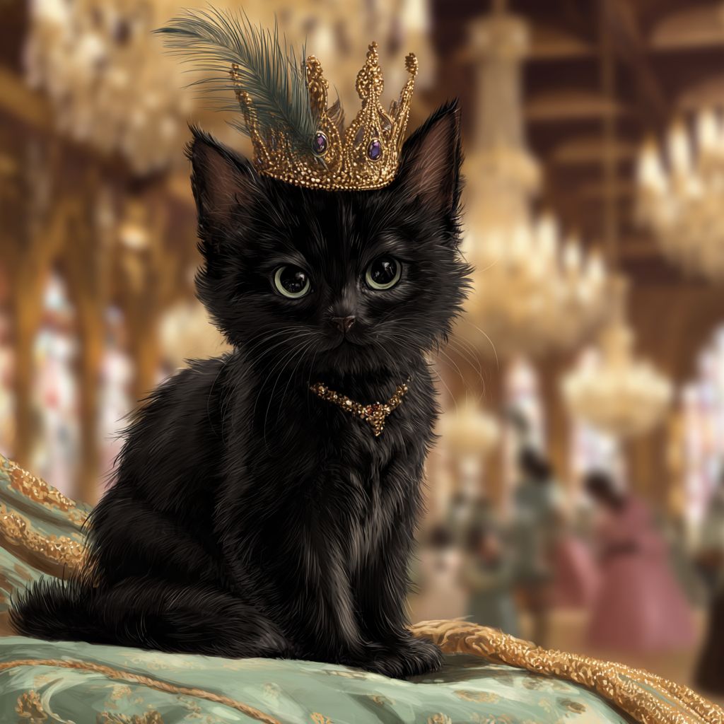 قط أمتياز أنمي بفرو أسود لامع، وعيون من الياقوت العميق، يرتدي تاجاً مزيناً بالذهب، جالساً على وسادة من الحرير، في داخل قصر فاخر مع ثريات.
