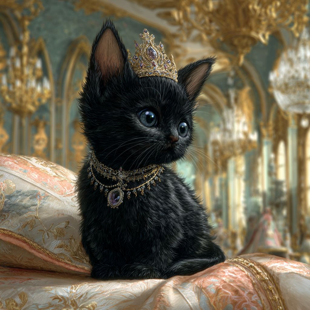 قطة أنمي ملكية بفرو أسود لامع وعيون زفيرية عميقة ترتدي تاجًا مزينًا بالذهب وتجلس على وسادة من الحرير في داخل قصر فخم