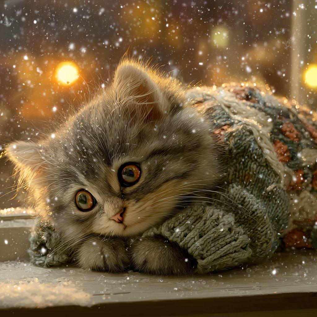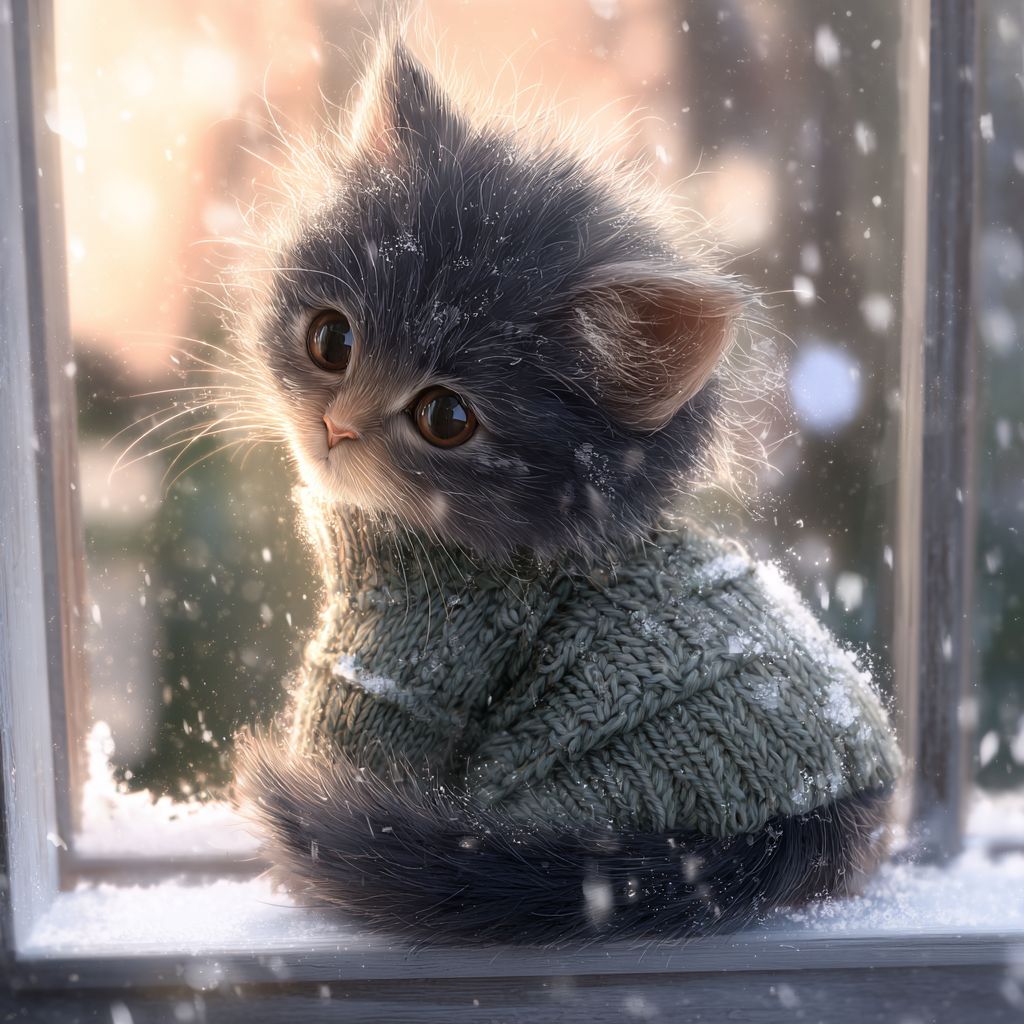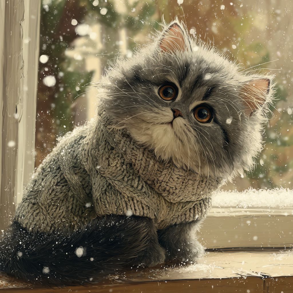 قطة أنمي لطيفة ذات فراء رمادي غزير، عيون بندق، ترتدي سترة محبوكة، ملتفة على حافة النافذة، مشهد خارجي ثلجي مع رقاقات تتساقط.