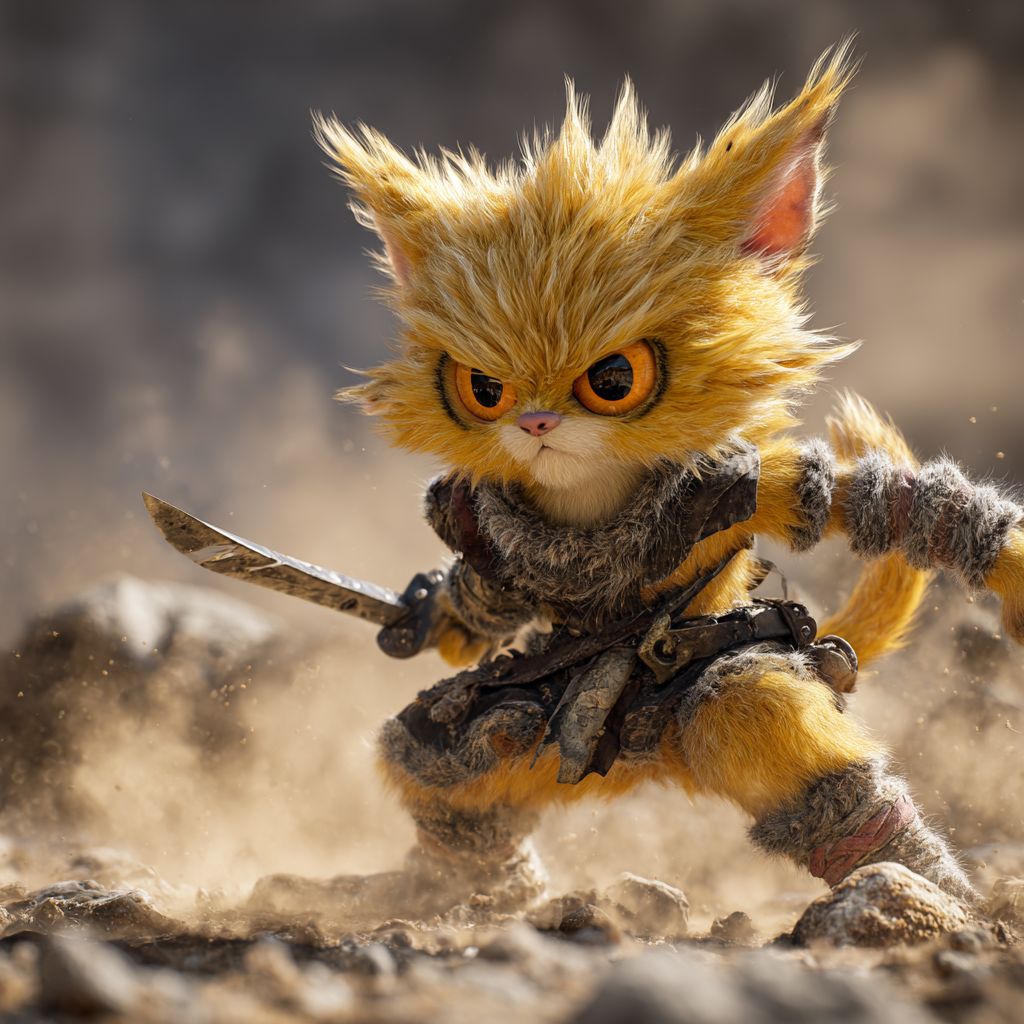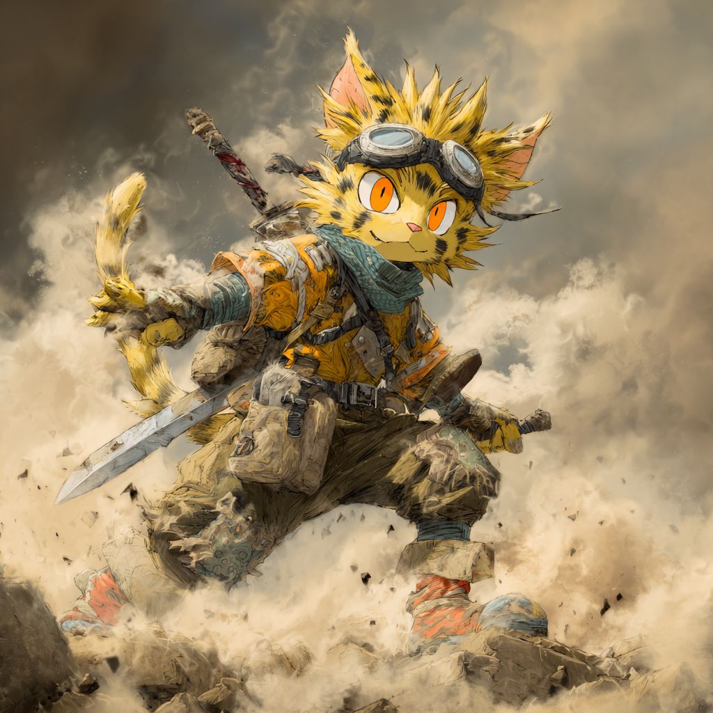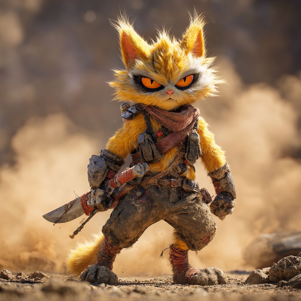 قطة أنمي جريئة بفرو أصفر منفوش ، وعينين برتقاليتين ، ترتدي حزام محارب وتمسك خنجراً ، في وضع جاهز للمعركة في ساحة معركة وعرة مليئة بغبار.