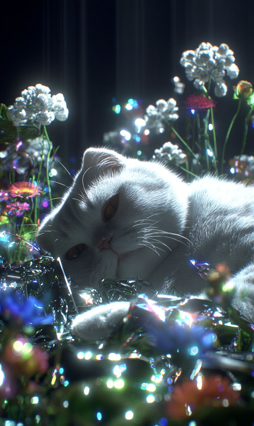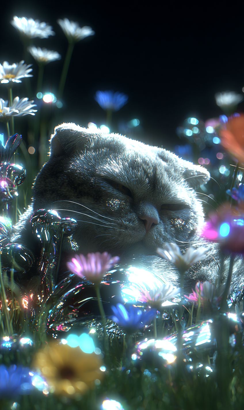 قط سكوتش فولد غريب يداعب النعاس بين الزهور البرية في مرج مشمس، آذانه مطوية مثل فن الأوريغامي.