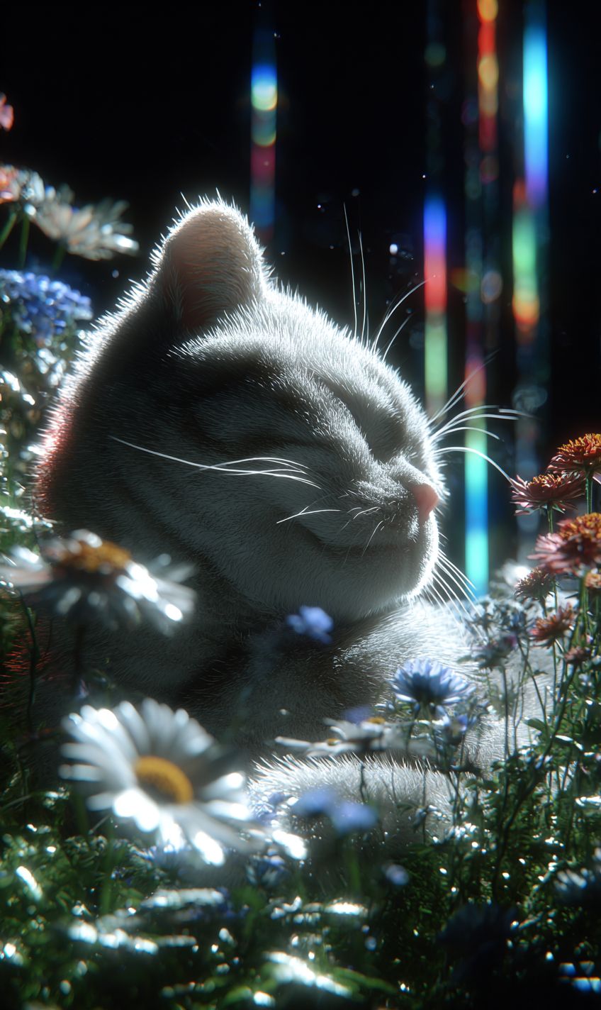 قط سكوتش فولد بأذنين مطويتين ينعم بالنوم في مرج مغطى بأزهار برية تحت أشعة الشمس