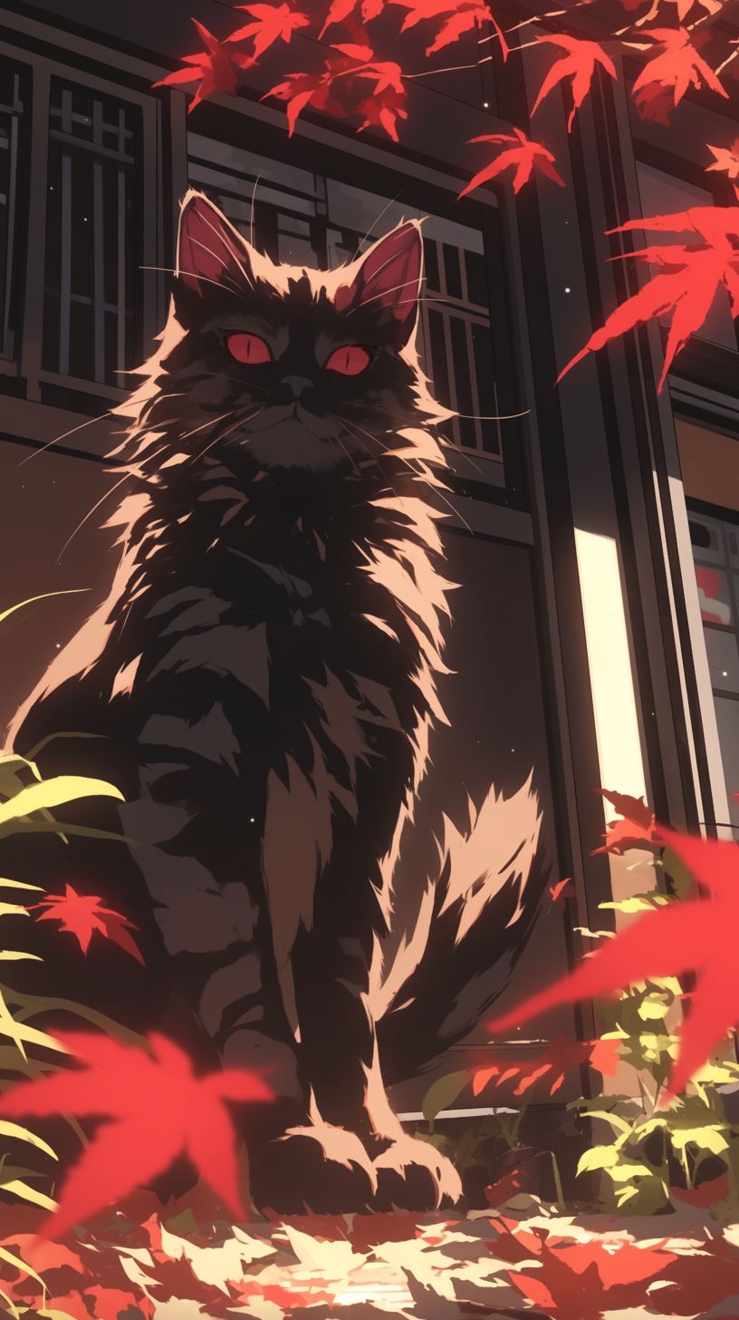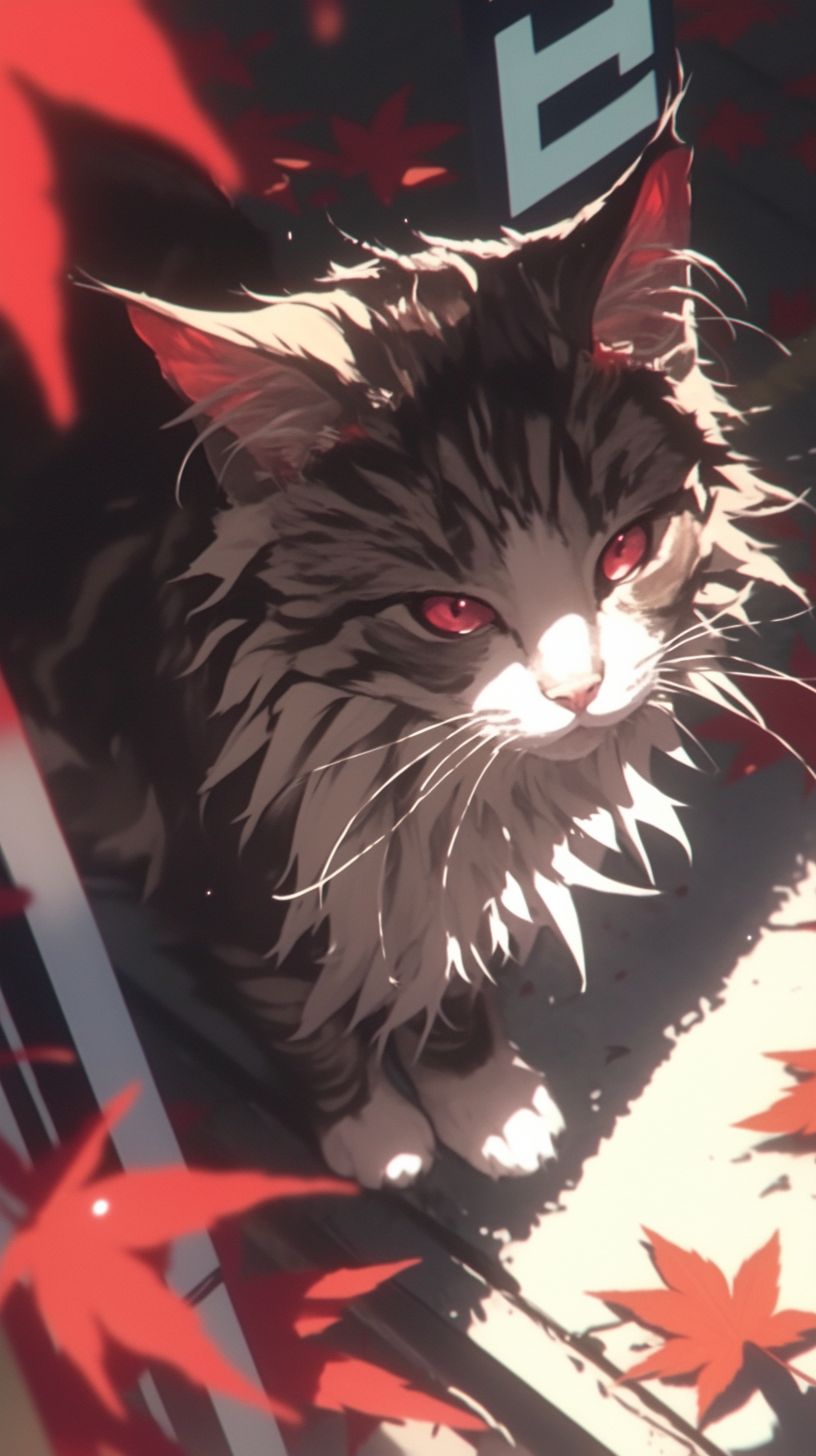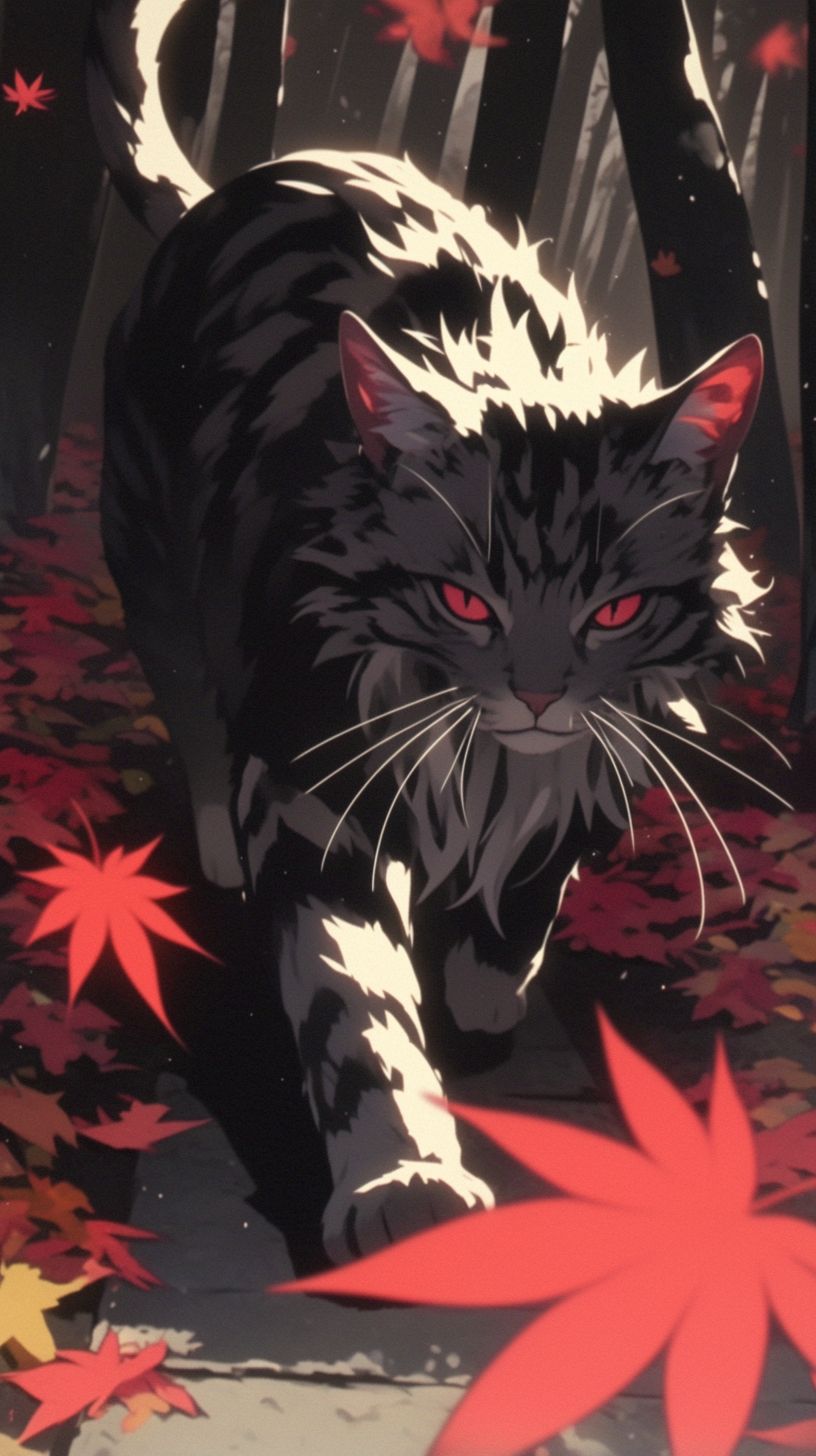 قط نرويجي غابة رقيق يت weaving عبر أوراق الخريف، شعره يمتزج مع أوراق الشجر الملتهبة.