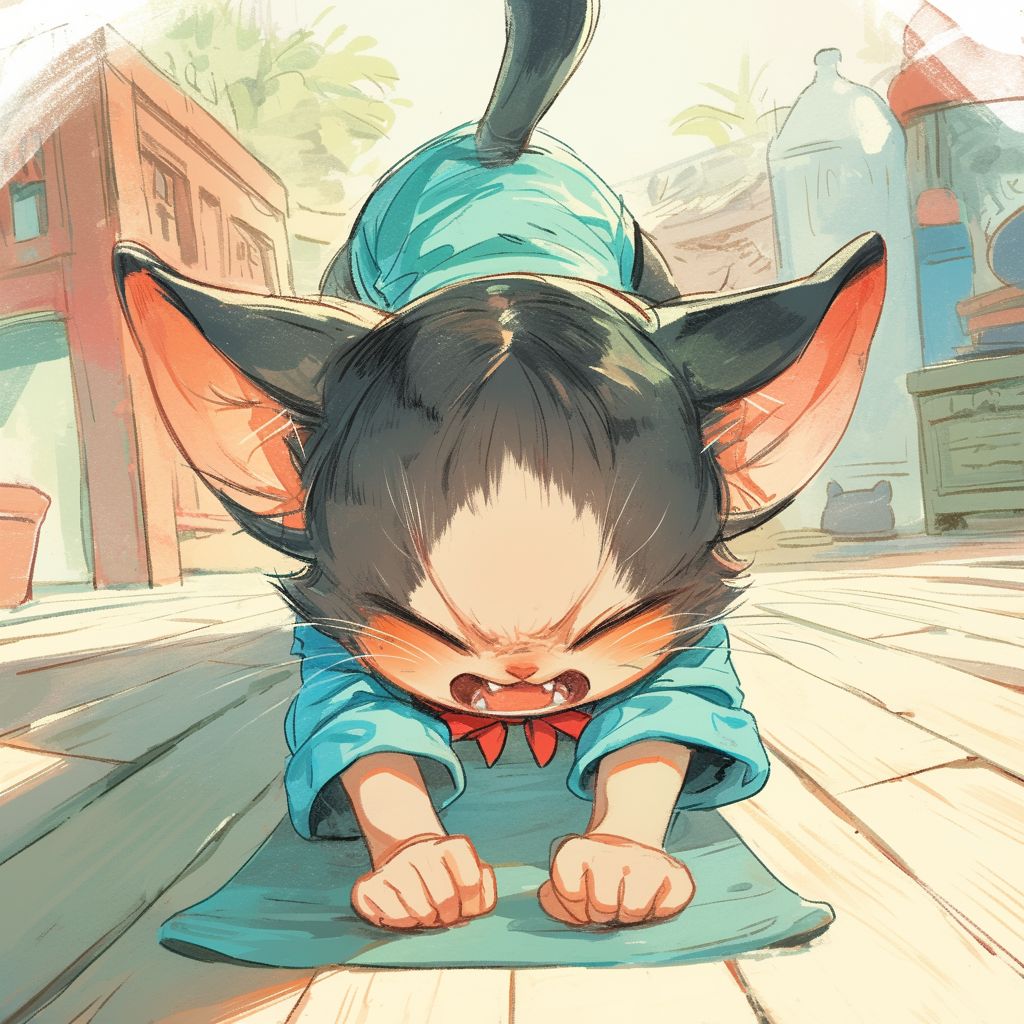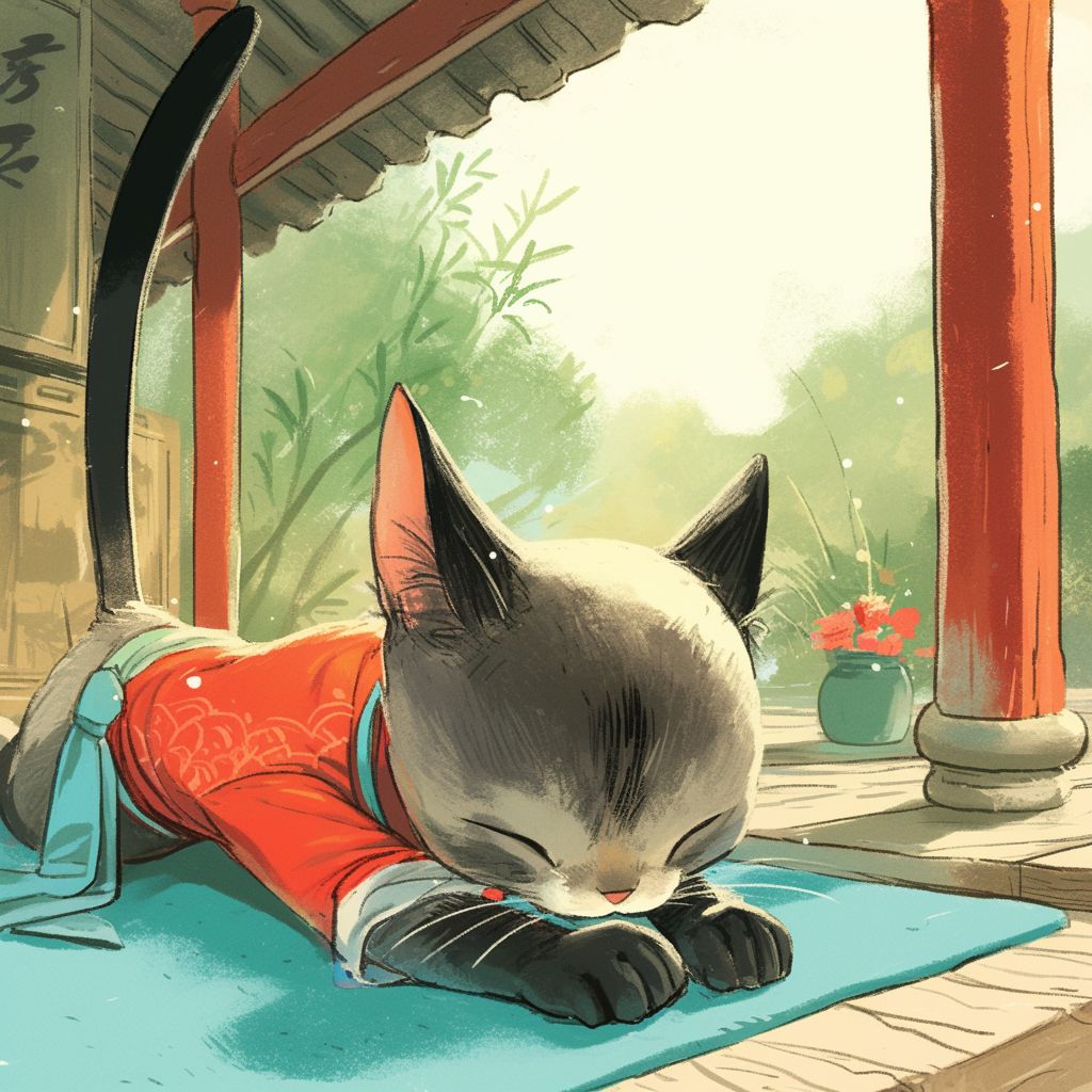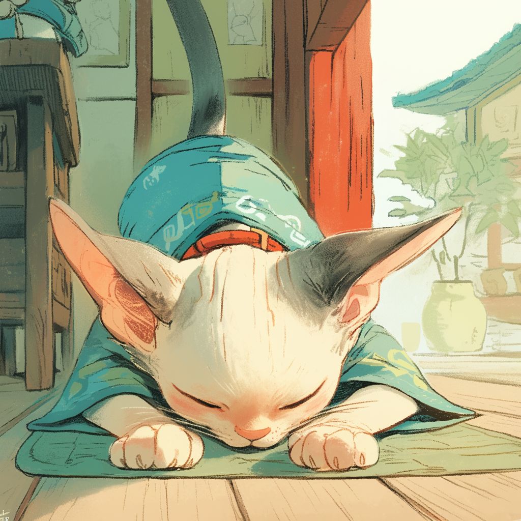 قطة شرقية قصيرة الشعر تتStretch على سجادة اليوغا وتعيش تجربة الزن المثالي