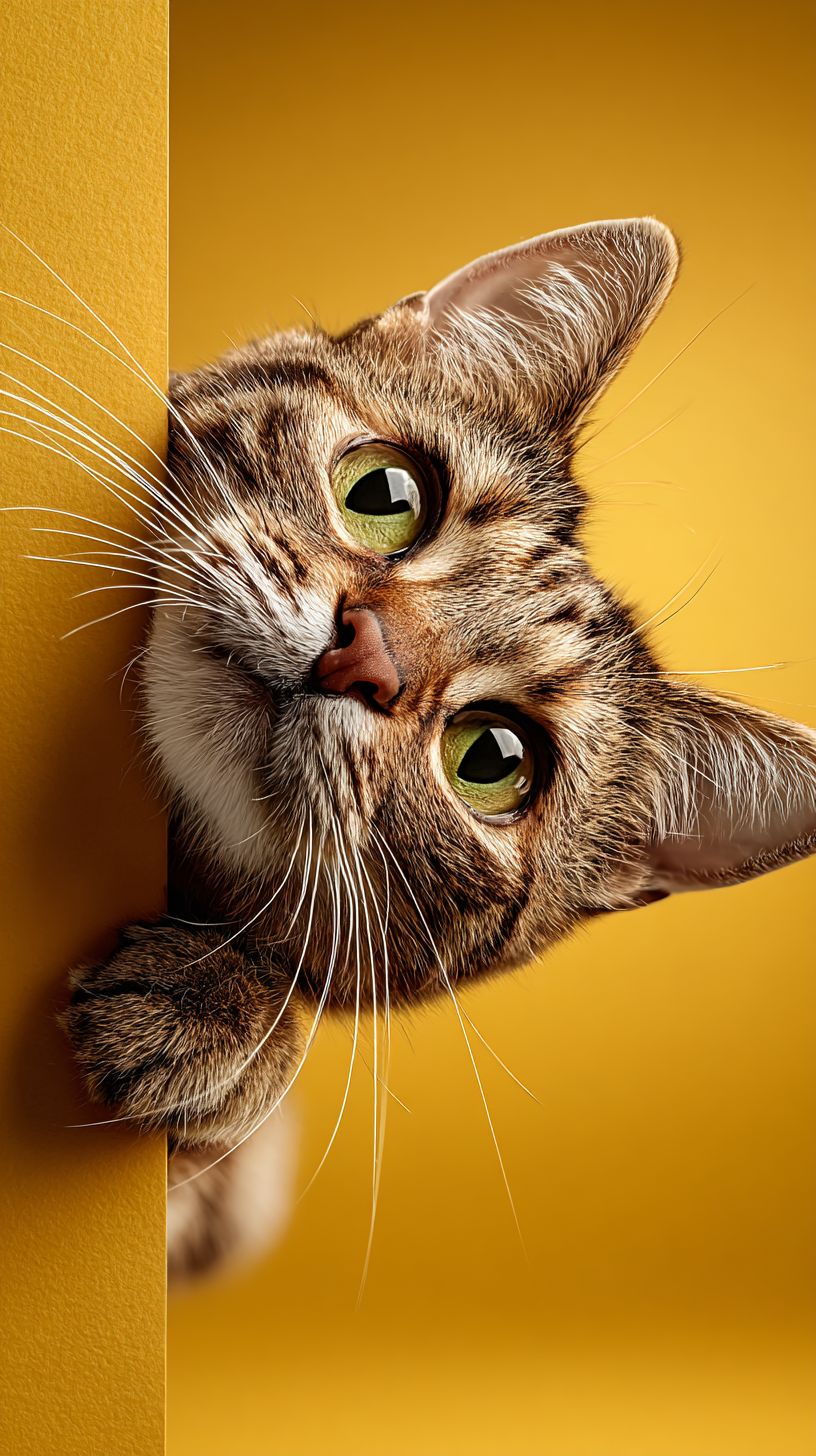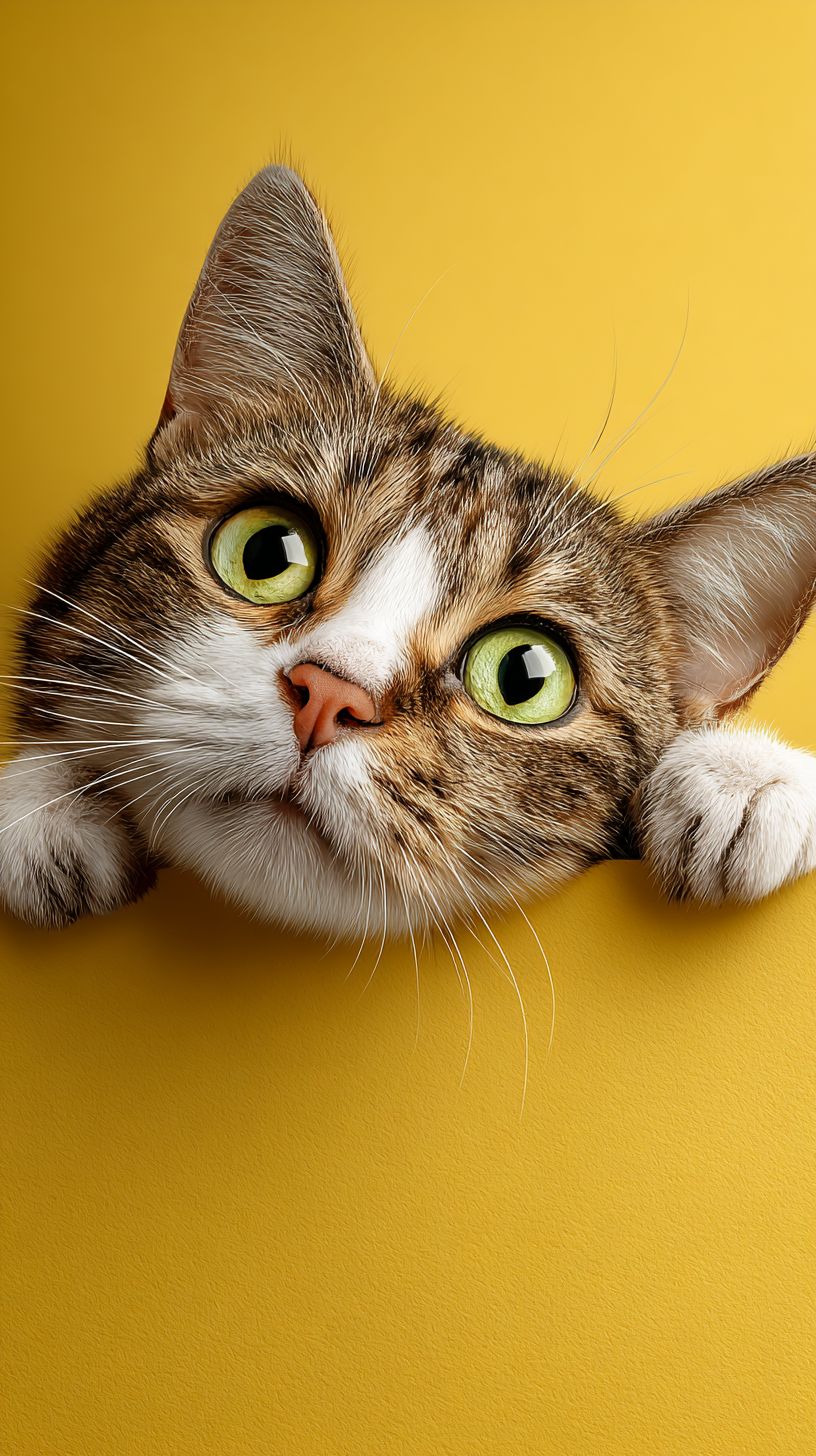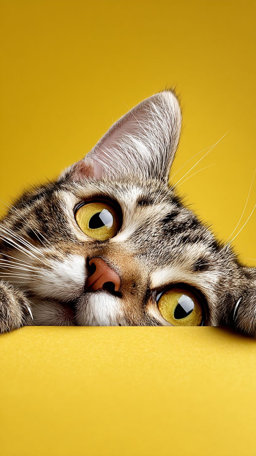 صورة لقط لذيذ يطل من الحافة، في وضع لطيف، على خلفية صفراء صلبة، تصوير مسطح.
