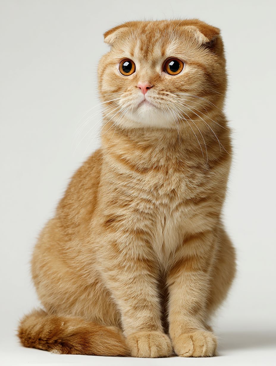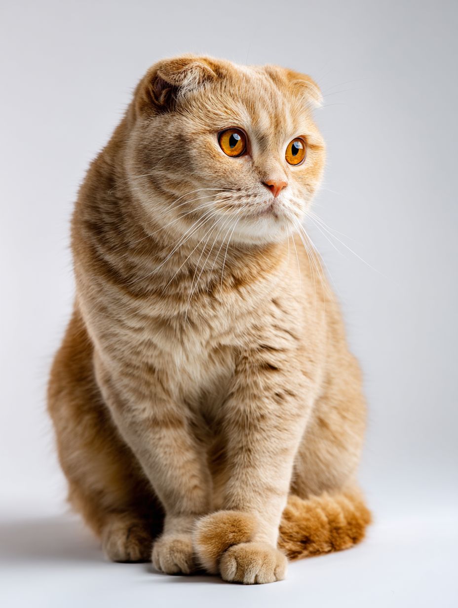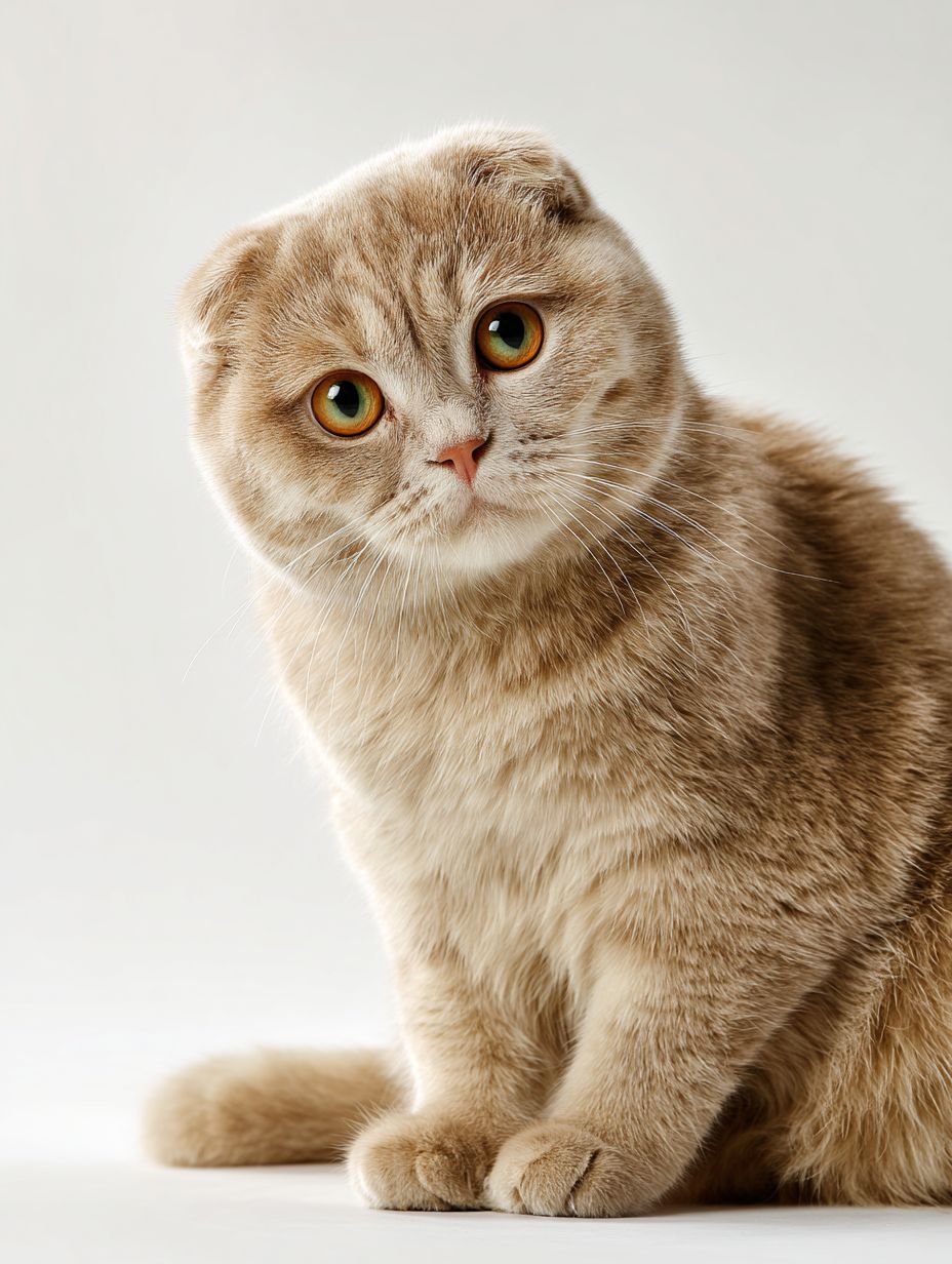 Eine Scottish Fold Katze sitzt im Dreiviertelansicht und schaut direkt in die Kamera vor einem weißen Hintergrund
