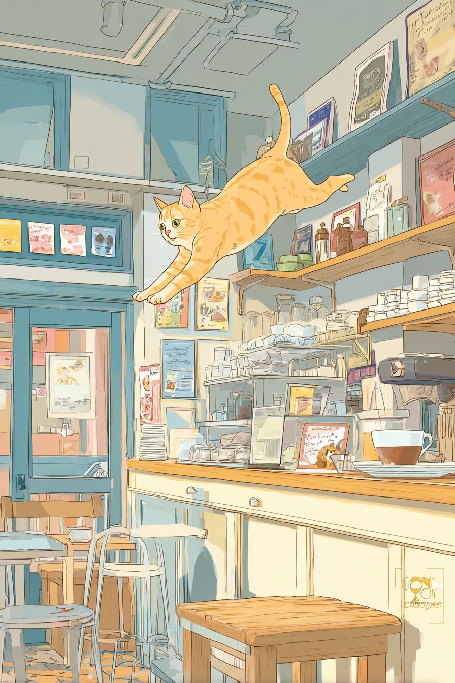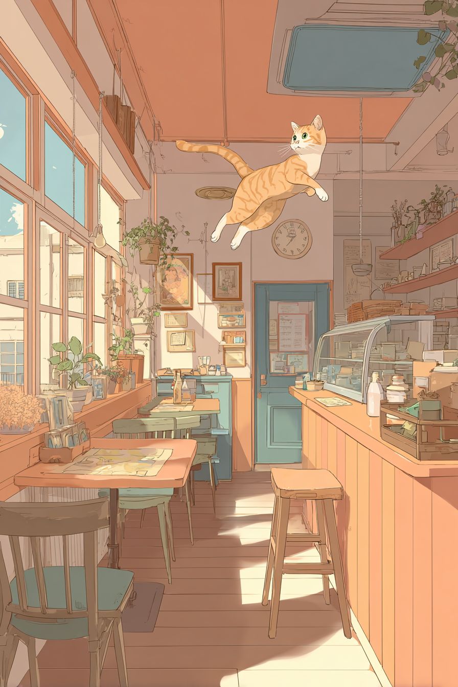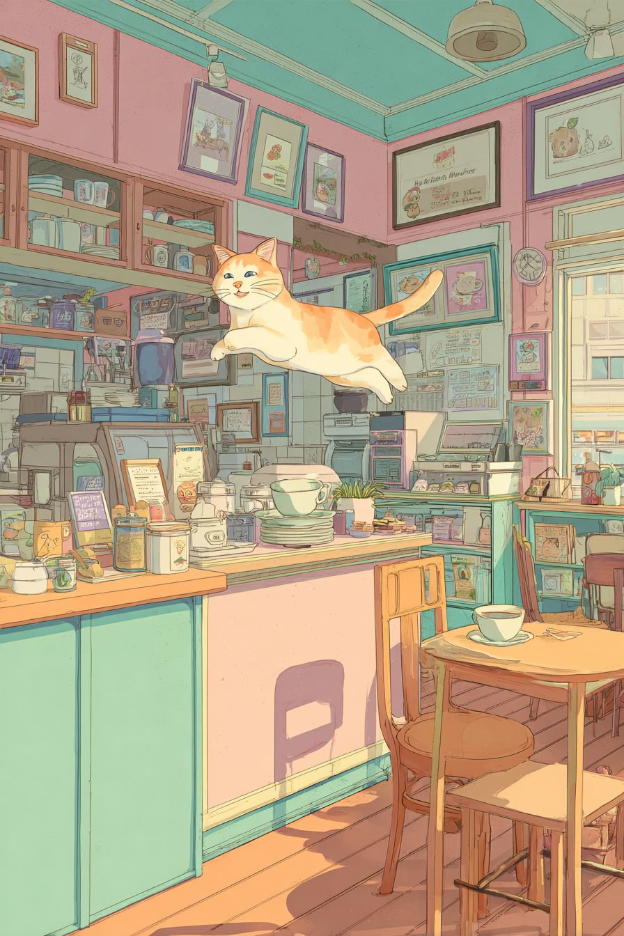 Eine Abyssinian-Katze, die in einem gemütlichen Café-Interieur springt, Slice-of-Life-Anime-Stil wie K-On, Pastellfarben, süße Ausdrücke, Alltagsgegenstände, entspannte Atmosphäre