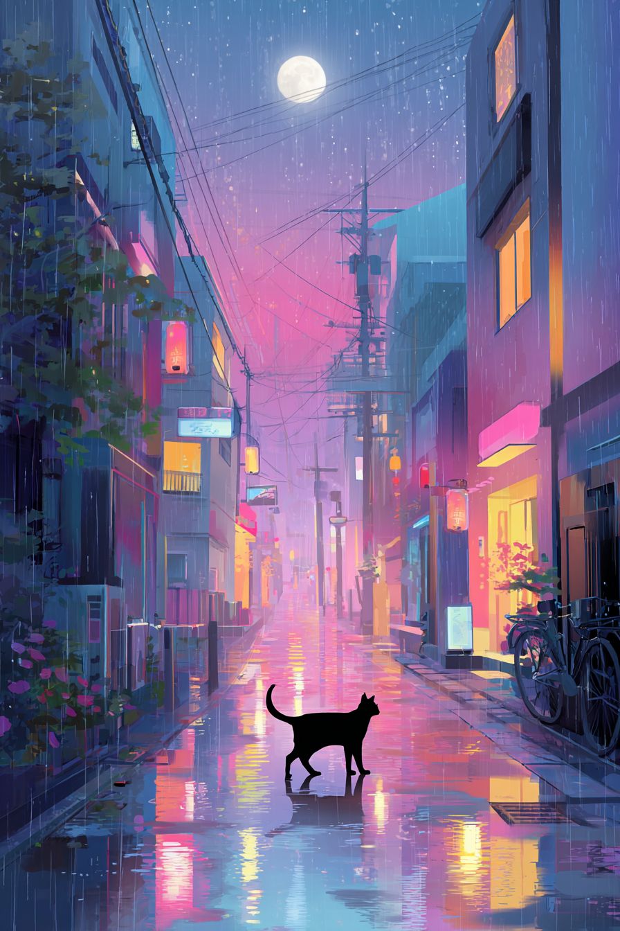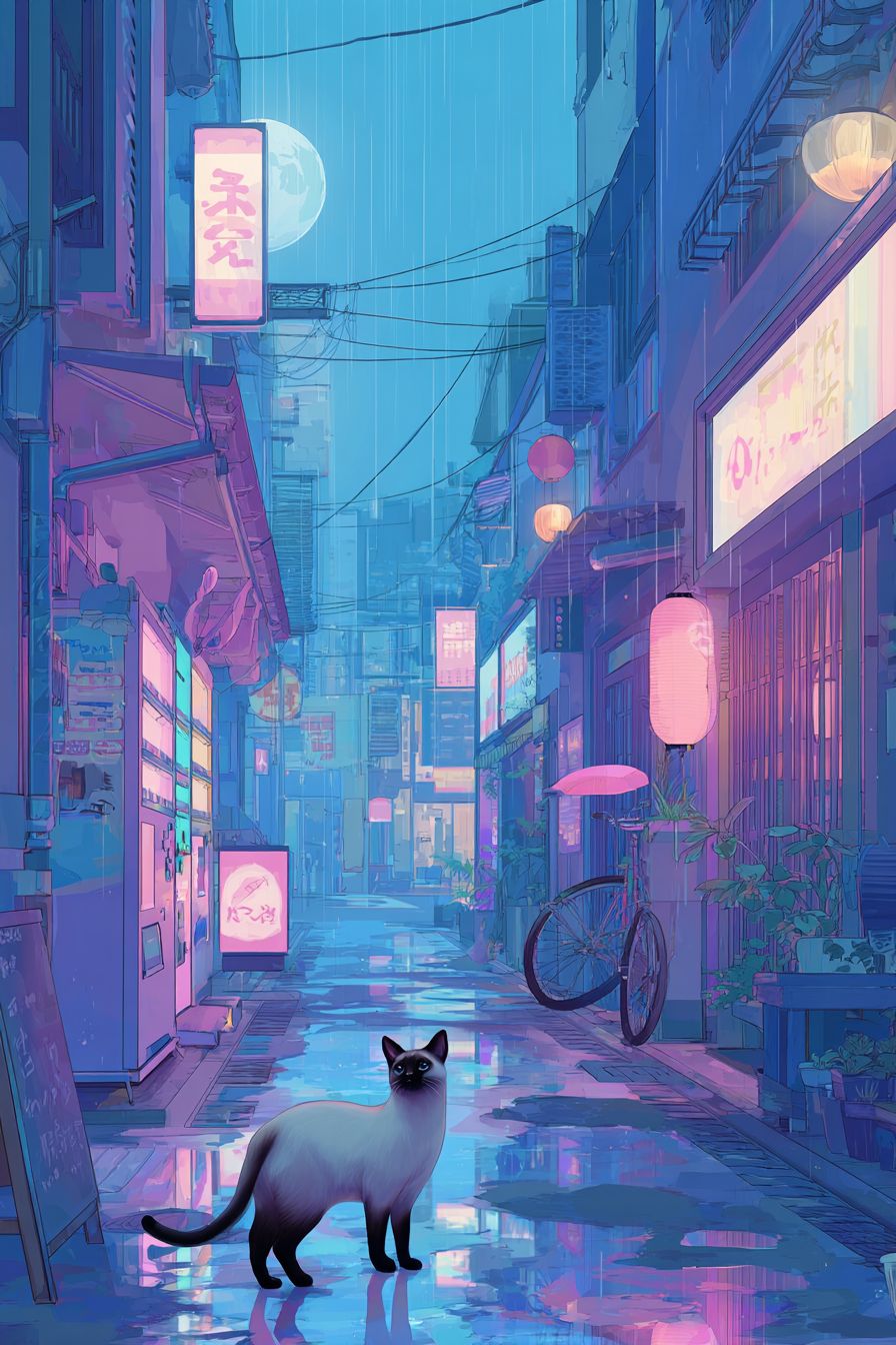 Eine schlanke Siamkatze, die im Mondlicht auf einer neondurchfluteten regnerischen Stadtstraße tanzt, im Slice-of-Life-Anime-Stil wie K-On, Pastellfarben, süße Gesichtsausdrücke, Alltagsobjekte, entspannte Atmosphäre.