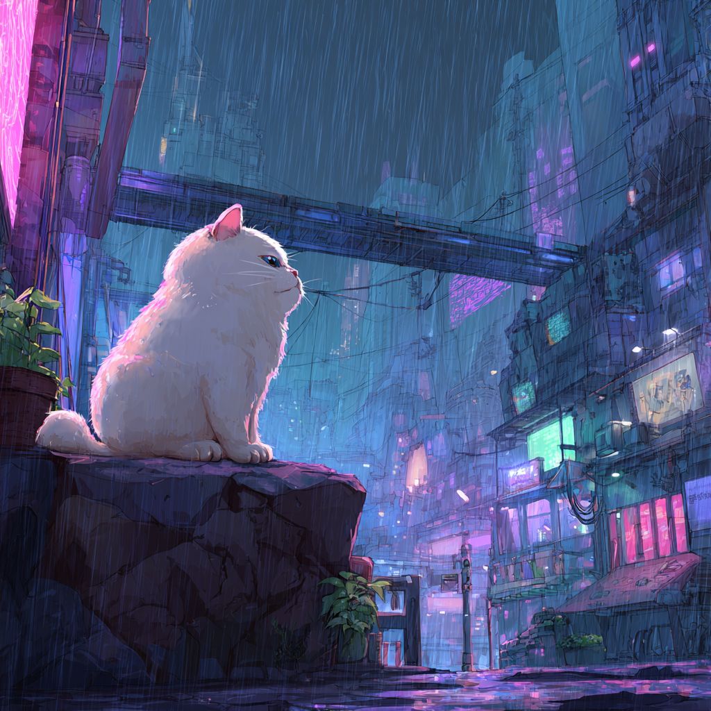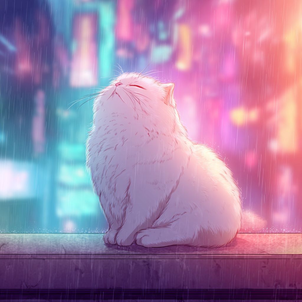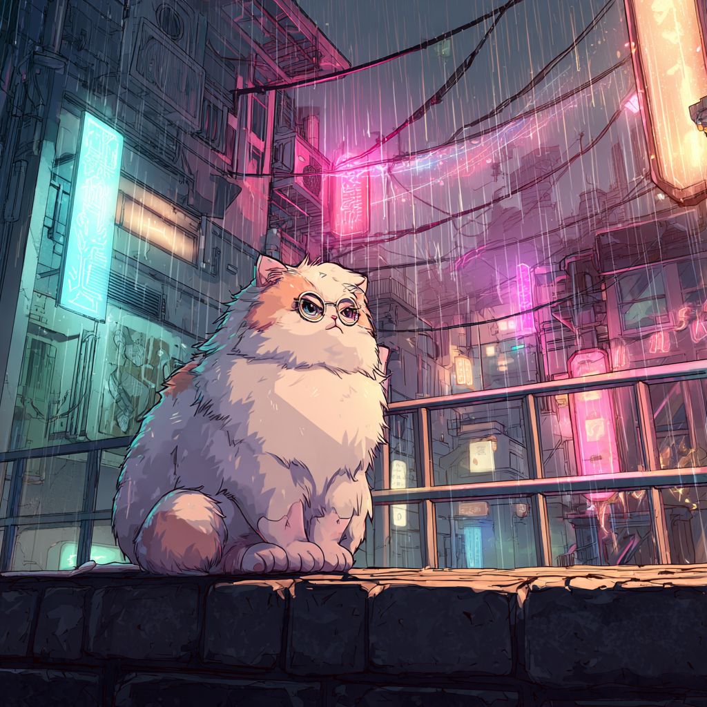 Eine Perserkatze, die auf einer Klippe meditiert, mit einer neongeschmückten regnerischen Stadtstraße im Hintergrund, Mecha-Anime-Stil wie Gundam, Pastellfarben, niedliche Ausdrücke, Alltagsgegenstände und eine entspannte Atmosphäre.