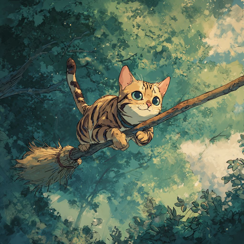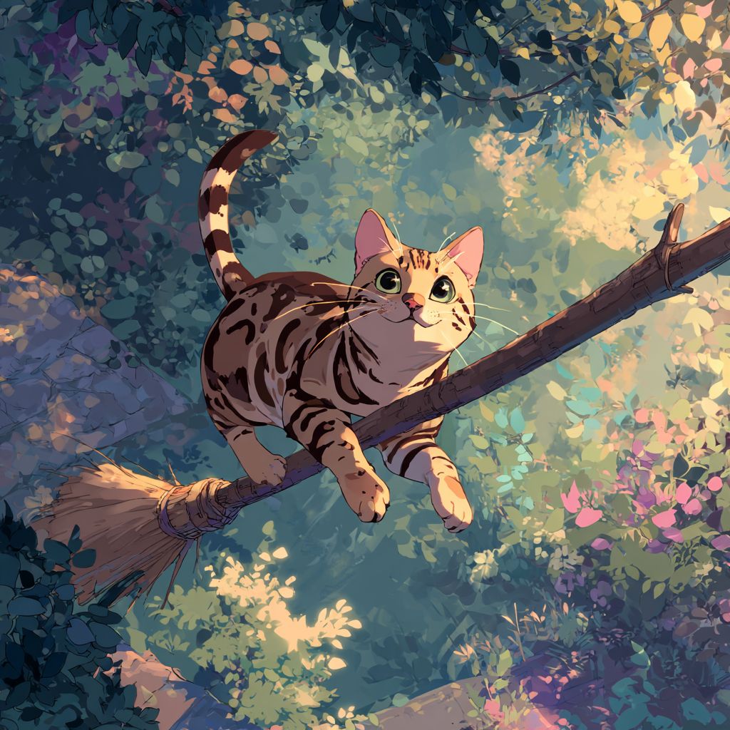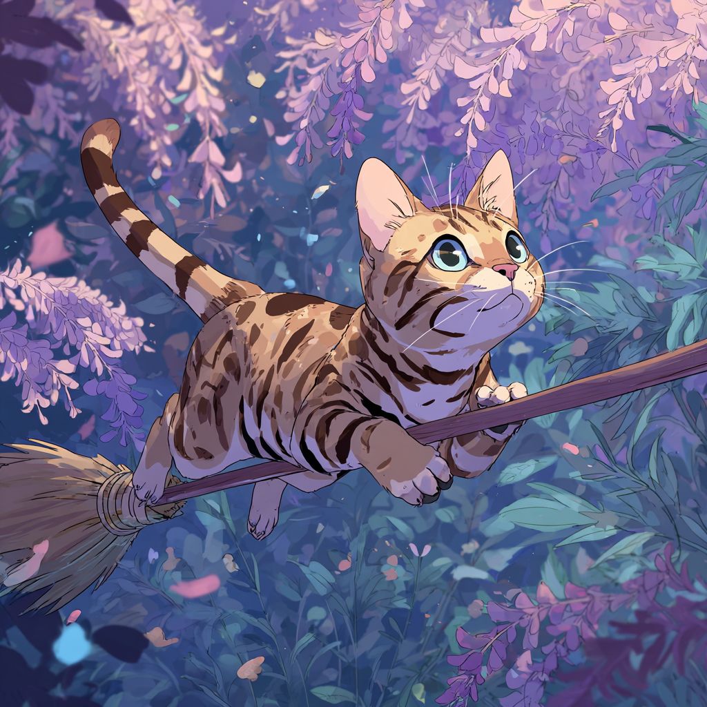 Eine Bengal-Katze, die auf einem Besen in einem üppigen verzauberten Wald reitet, dramatische Anime-Actionpose inspiriert von Naruto, Pastellfarben, süße Ausdrücke, Alltagsgegenstände, entspannte Atmosphäre.