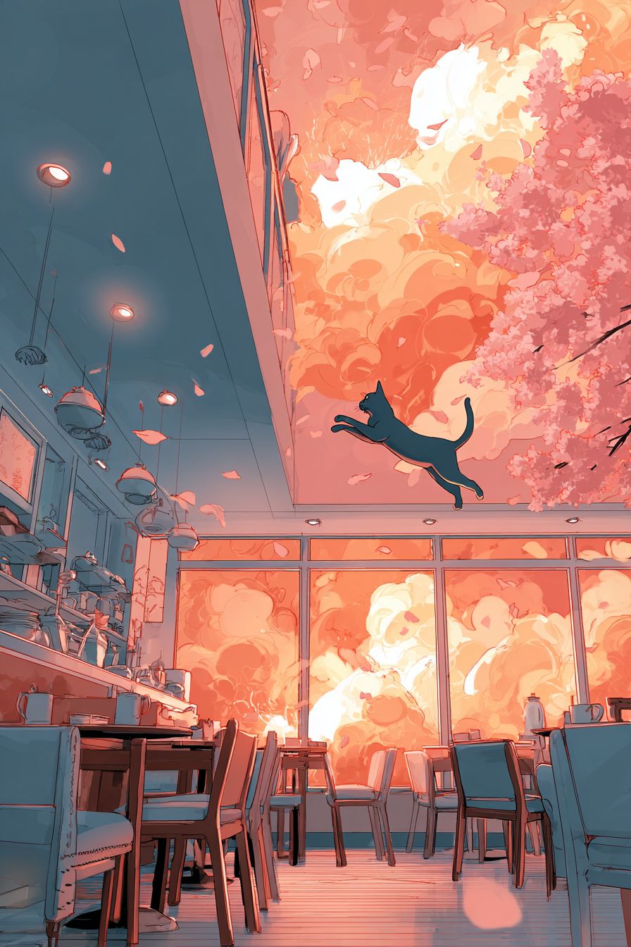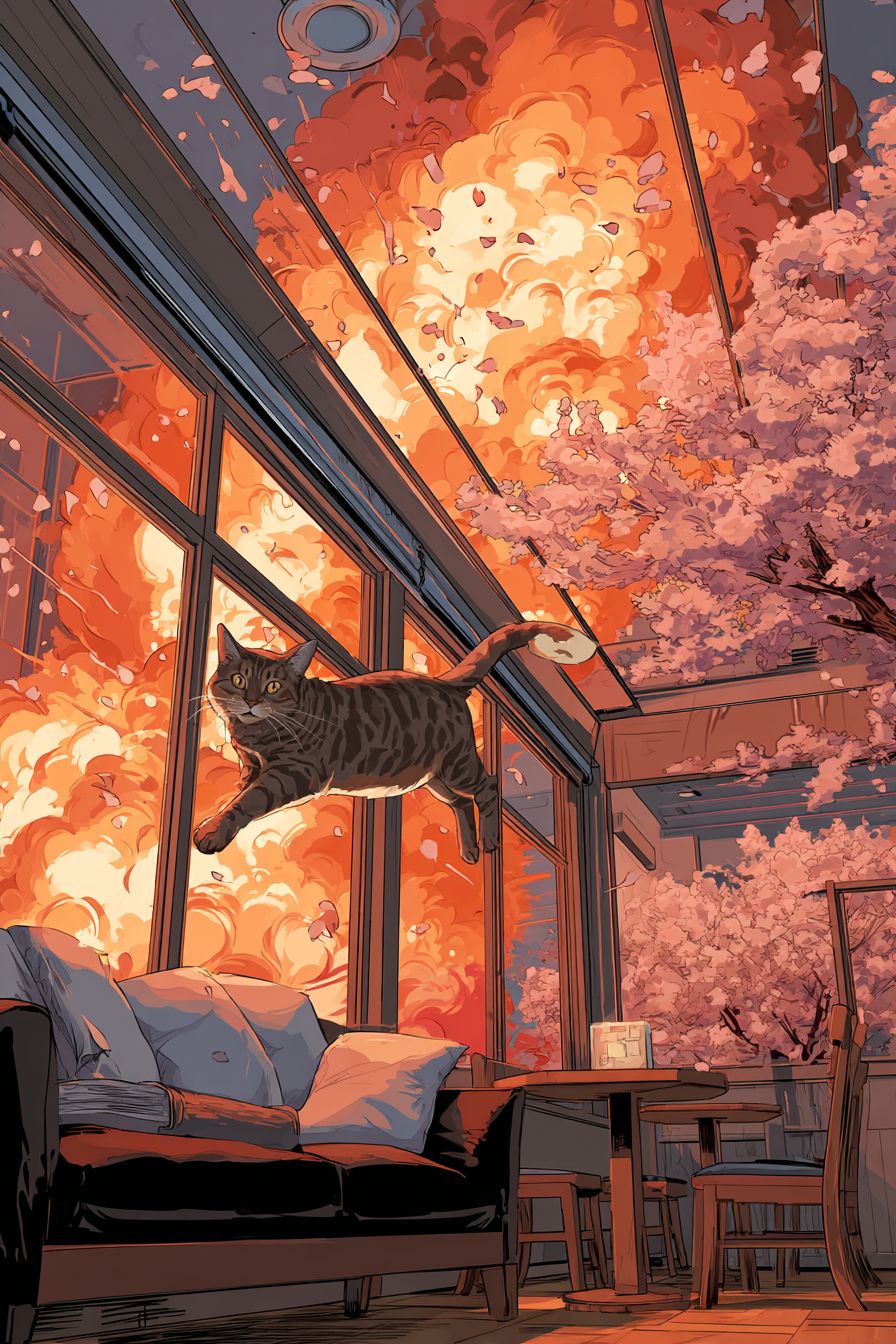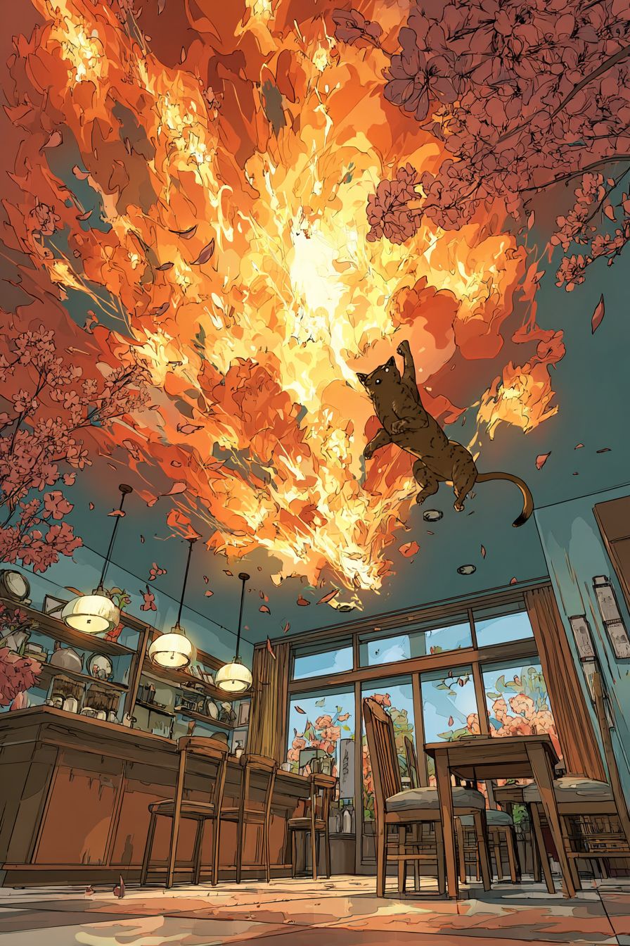 Eine Abessinierkatze springt in das gemütliche Innere eines Cafés, im Slice-of-Life-Anime-Stil wie K-On, mit feurigen Explosionen und Kirschblüten im Hintergrund, intensiver Schattierung und epischer Komposition.