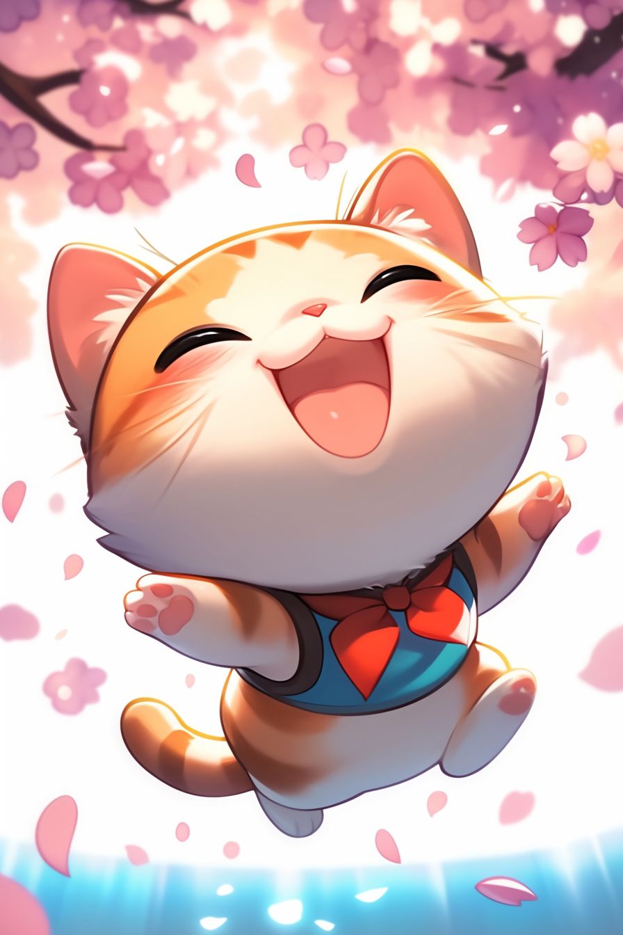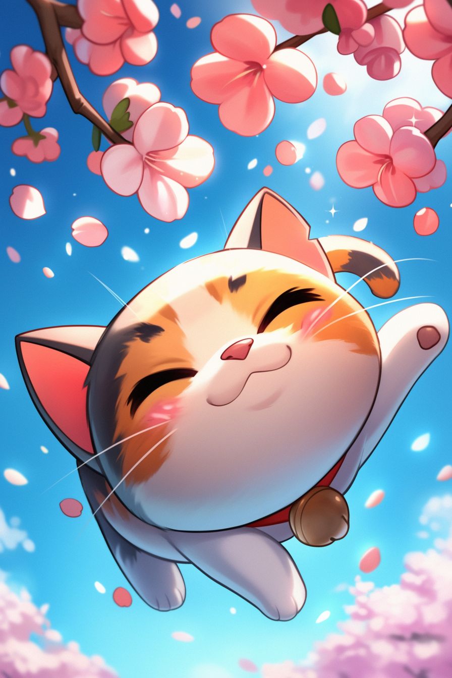 Eine freche dreifarbige Katze schlägt auf schwebende Kirschblüten in einer sanften Frühlingsbrise
