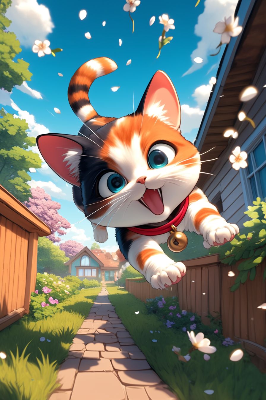 Eine schelmische Dreifarbige Katze, die in einer sanften Frühlingsgartenbrise nach schwebenden Kirschblüten schnappt.
