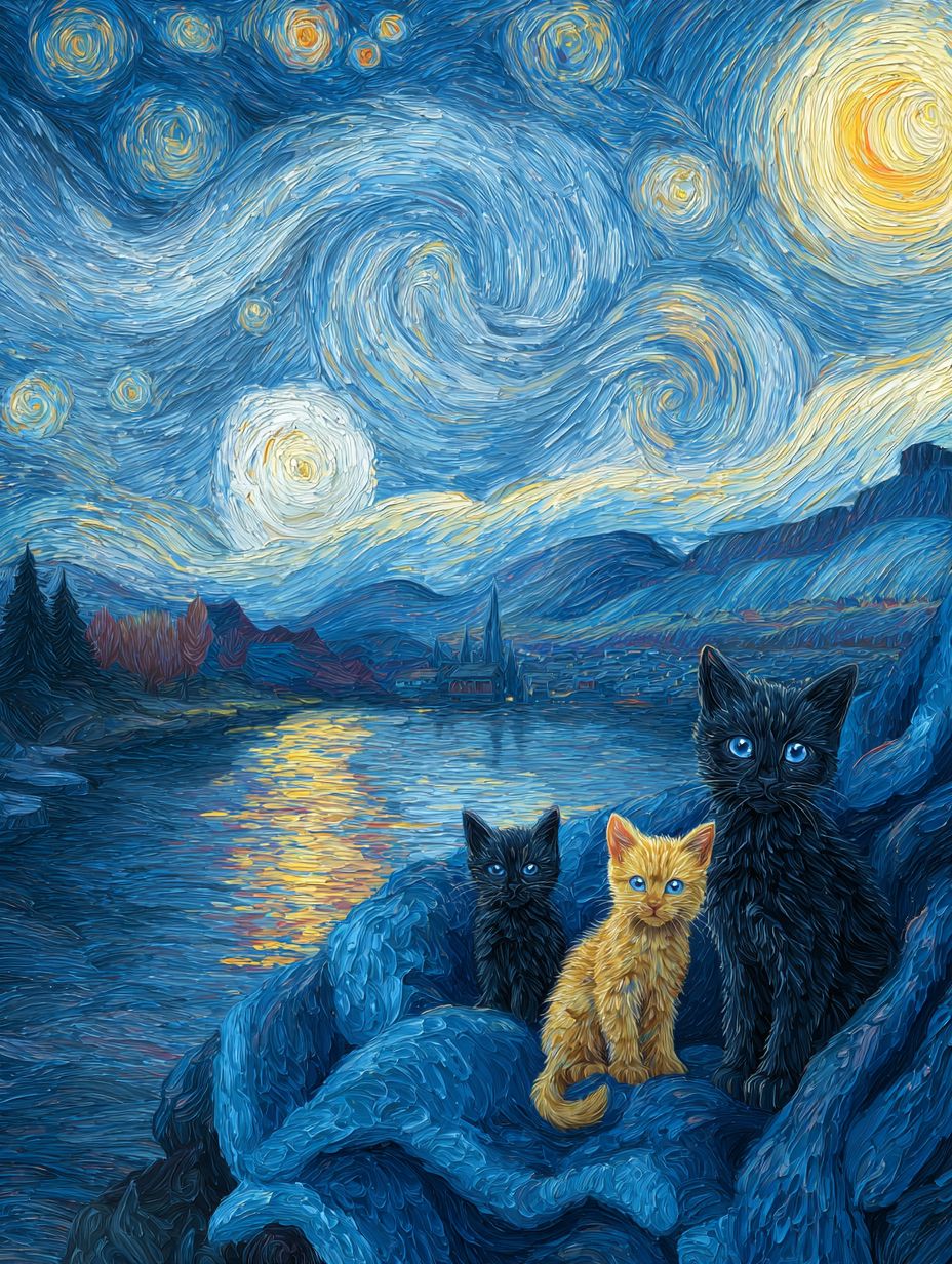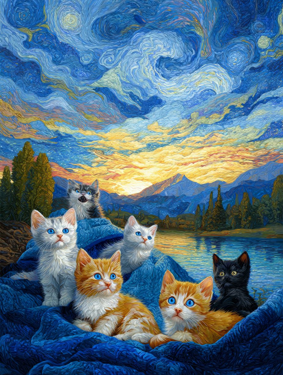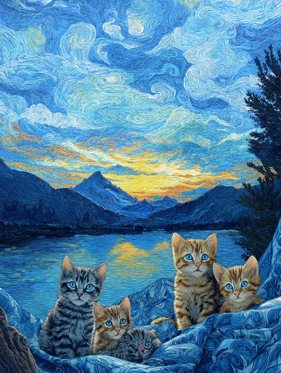 Un groupe de chatons dans le style de La Nuit étoilée de Van Gogh, assis sur une grande couverture bleue au bord de l'eau, avec des montagnes et des arbres en arrière-plan, un ciel lumineux avec des tourbillons de nuages blancs, des yeux bleus, et un lever de soleil jaune brillant, peinture, détaillée, réaliste.