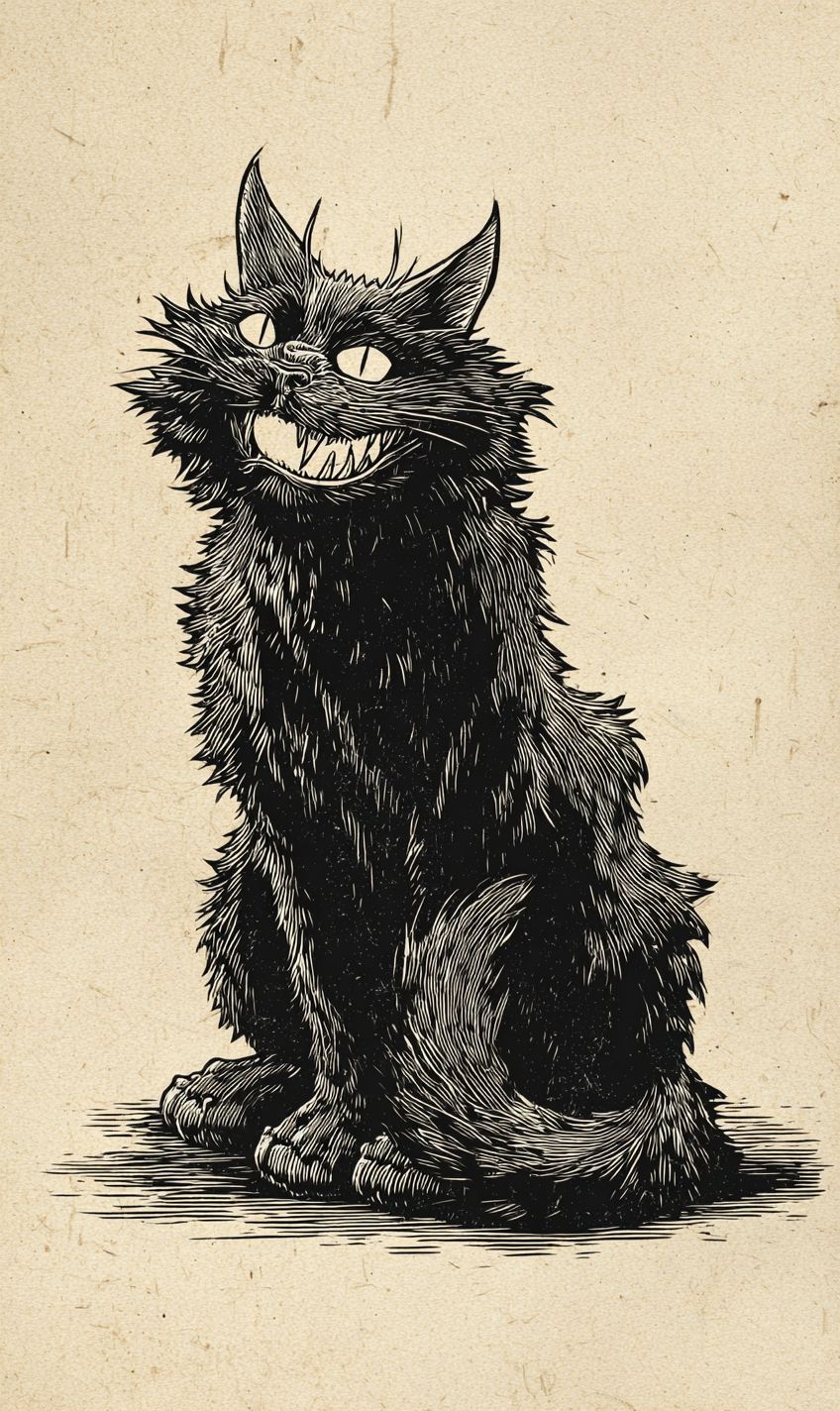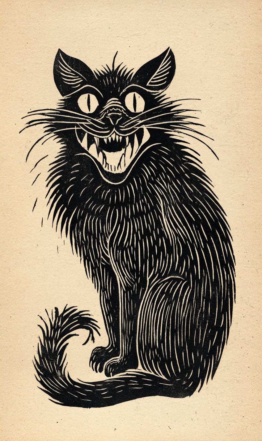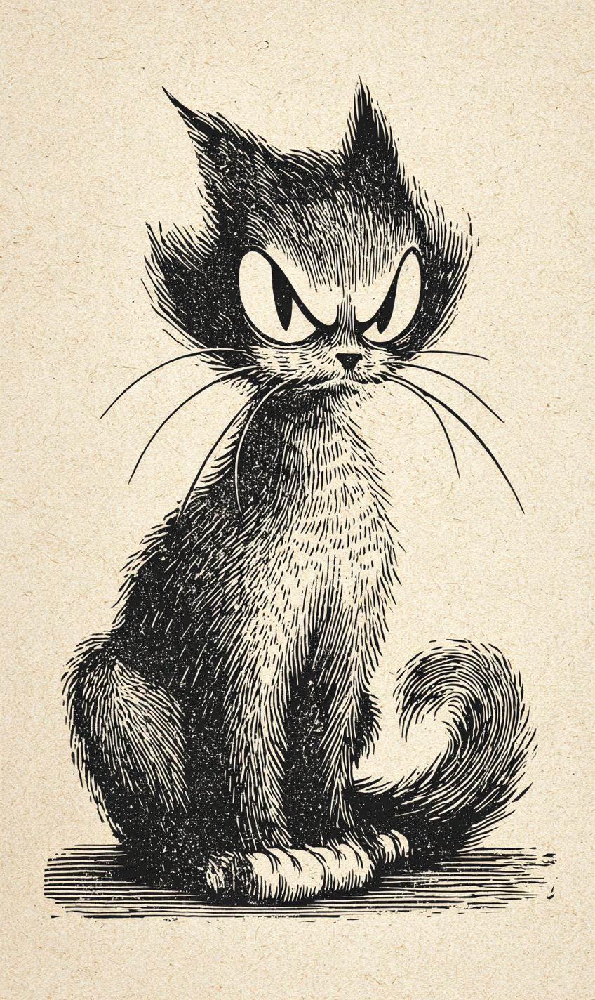 Une simple illustration en bois d'un chat en colère, en encre noire et blanche sur papier, avec la texture visible à certains endroits. La couleur de fond devrait être beige ou crème pour mettre en valeur les détails.