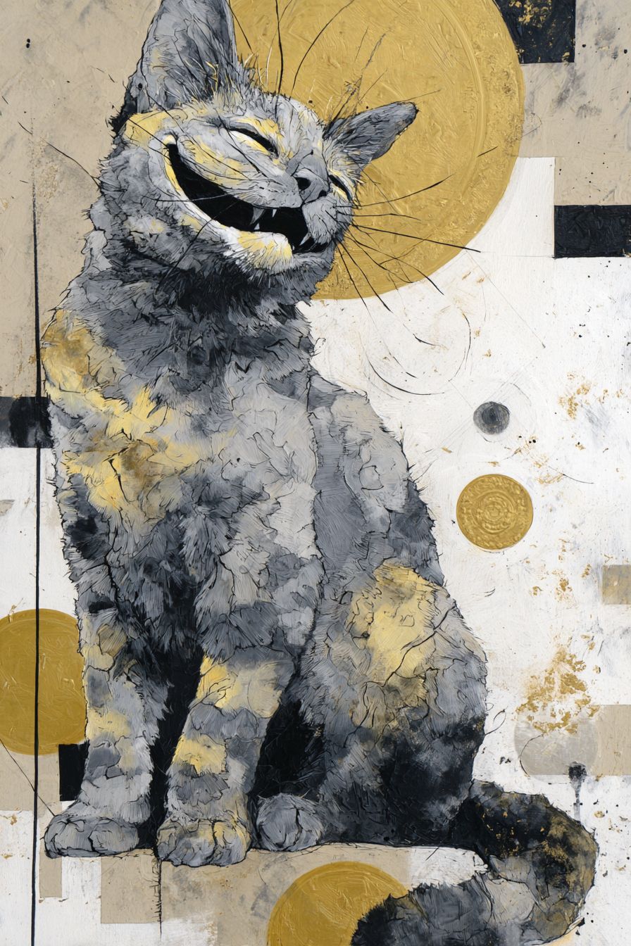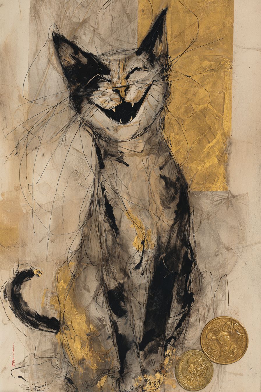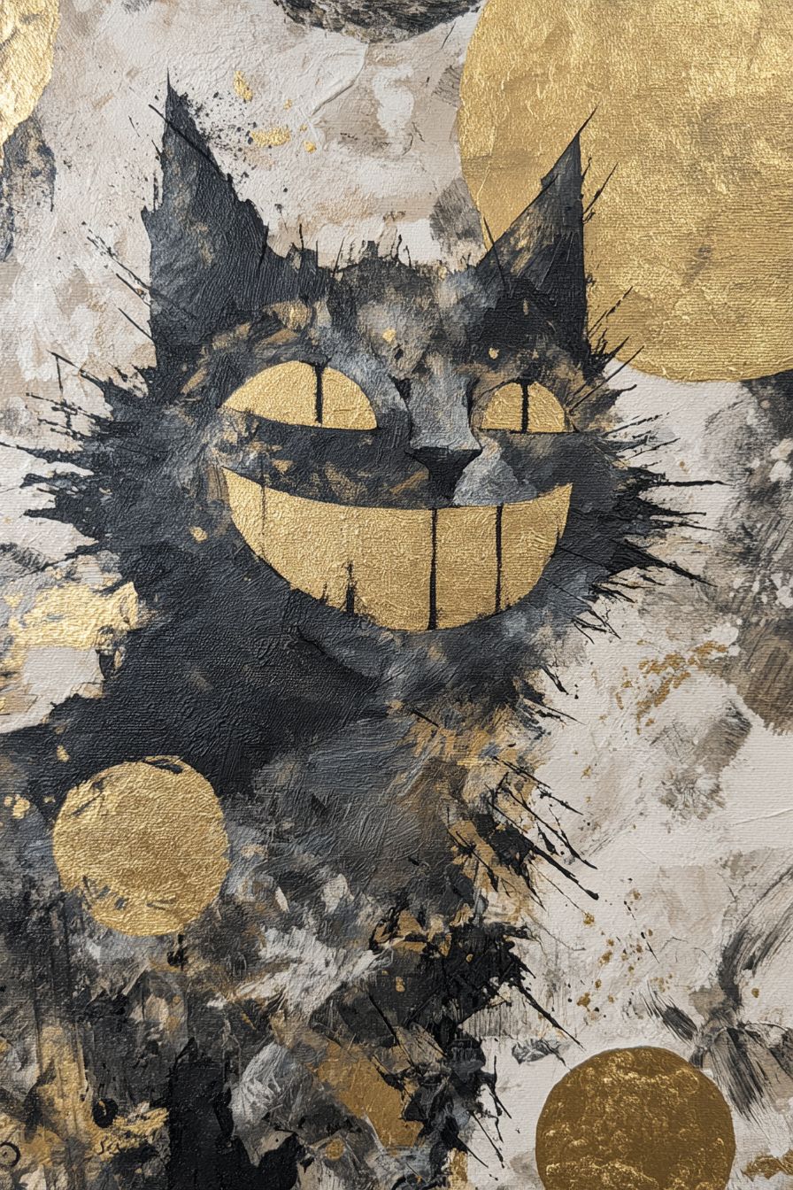 Chat noir, une peinture abstraite à l'acrylique sur toile, avec un visage souriant, dans une palette de couleurs dorée et beige, avec des lignes d'encre noire. Un chat assis, regardant droit devant, dans le coin inférieur droit de l'image se trouvent trois pièces victoriennes dorées.