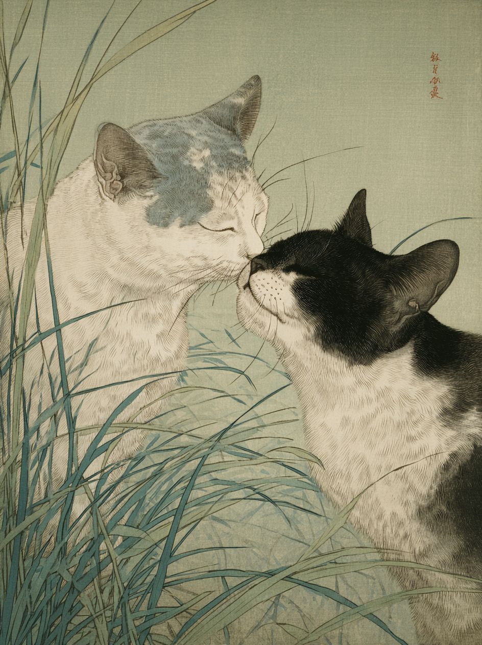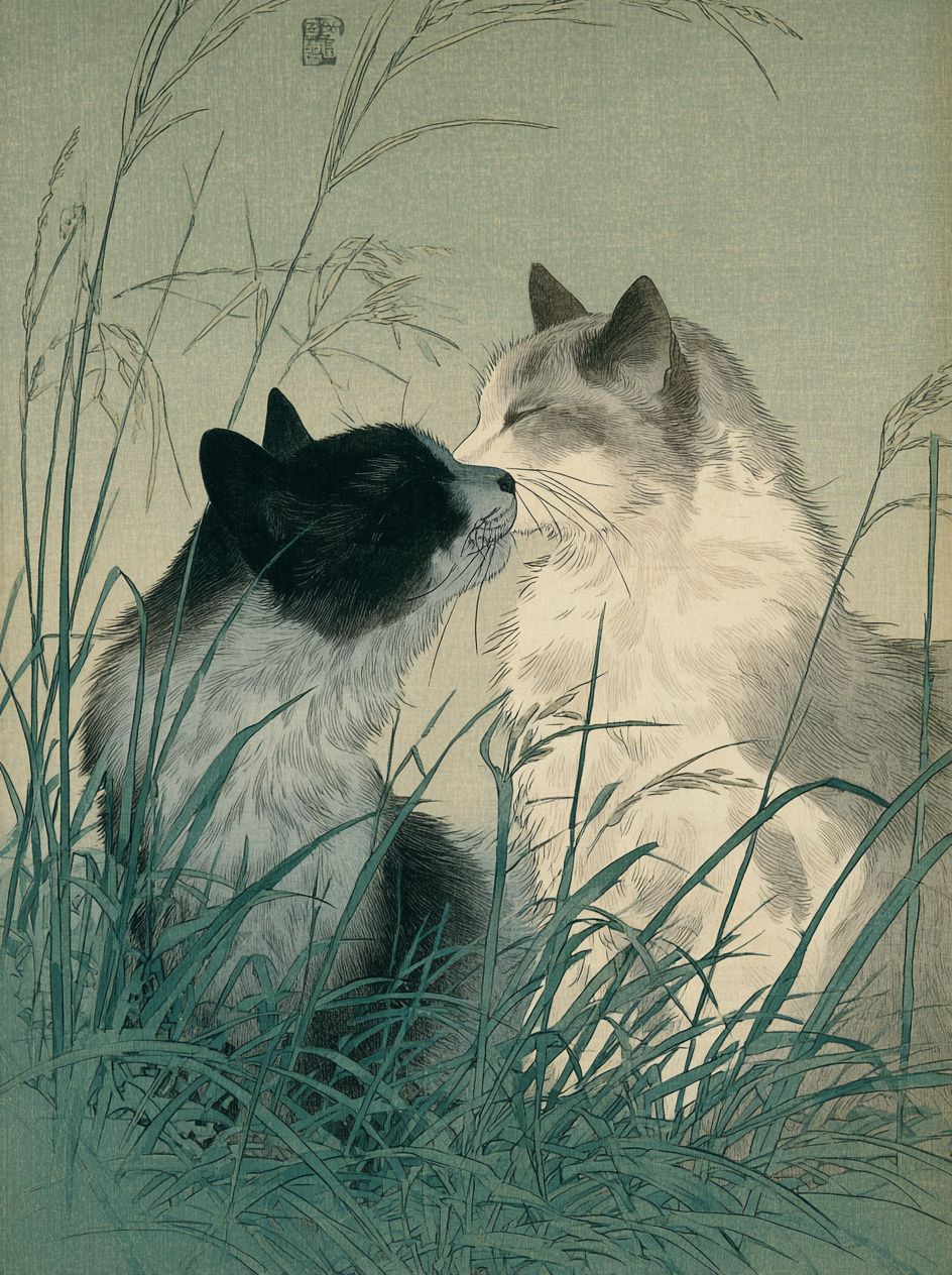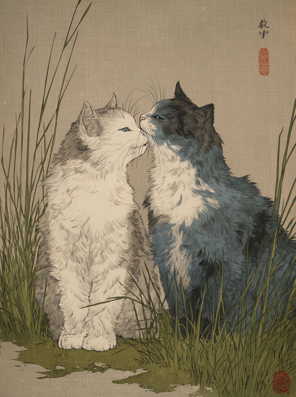 灰と白の猫が青と灰色の毛皮の別の猫にキスをするシーンは、草の背景に対して日本の浮世絵スタイルであり、薄緑の背景があります。この絵は上村松園のスタイルを描写し、細かい筆致で優雅で詳細な、レトロな美学に満ちています、そして葛飾北斎のスタイルを参考にしています。この画像は非常に詳細で、鋭い焦点を持ち、高解像度です。