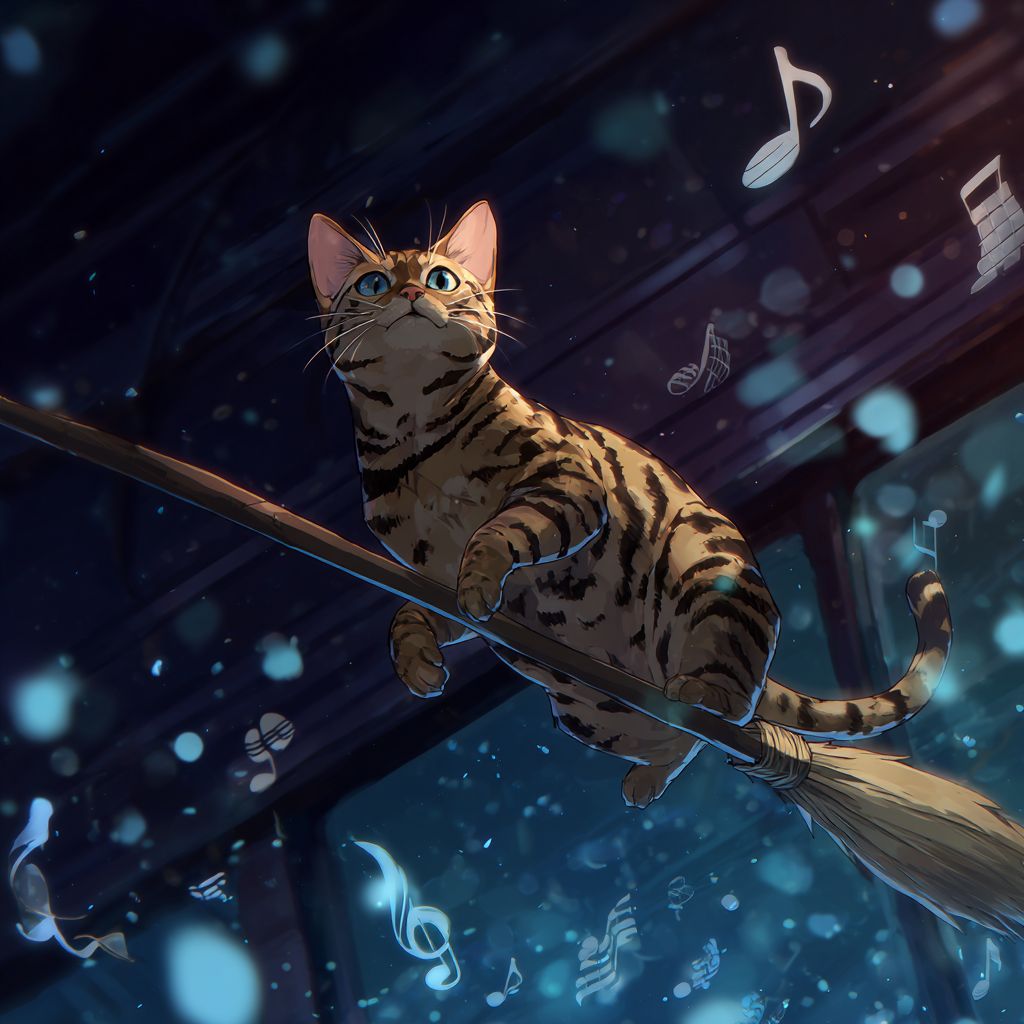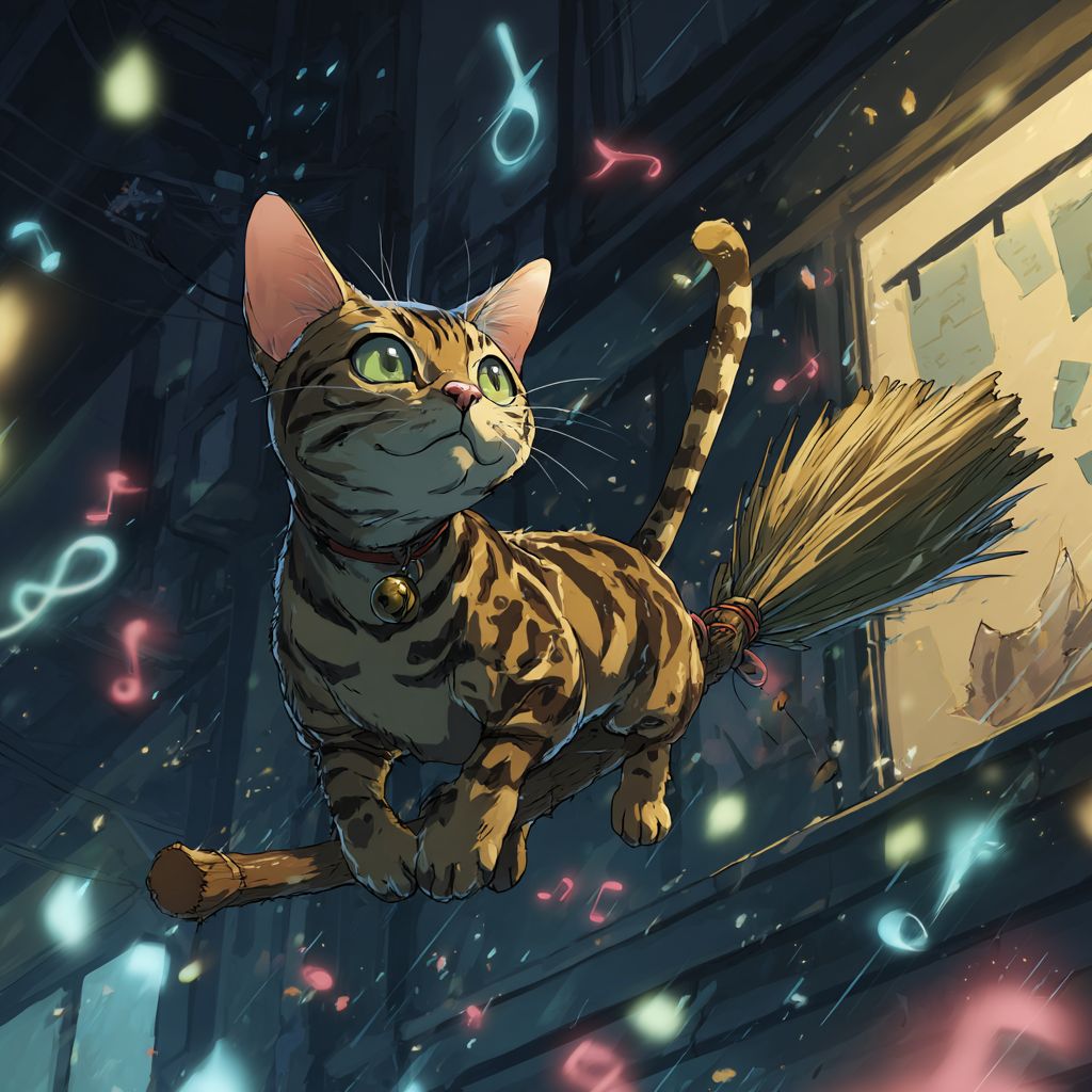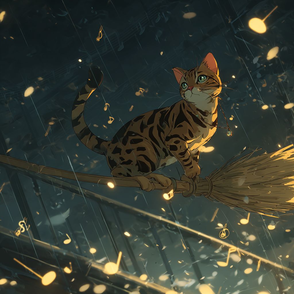 バンガル猫がほうきに乗って、ゼロ重力の宇宙ステーションで浮かんでいる、東京喰種のようなホラーアニメスタイル、優しい雨、感情的なクローズアップ、浮かぶ音符、心に響くトーン