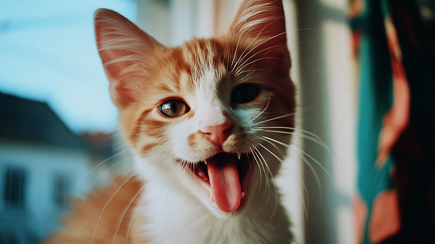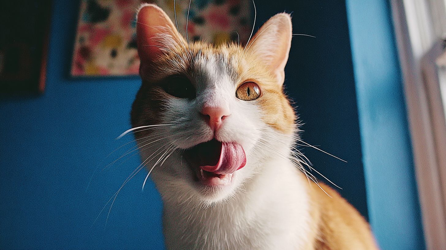 オレンジと白の猫がピンクの舌を出し、大きな目とかわいい笑顔を見せています