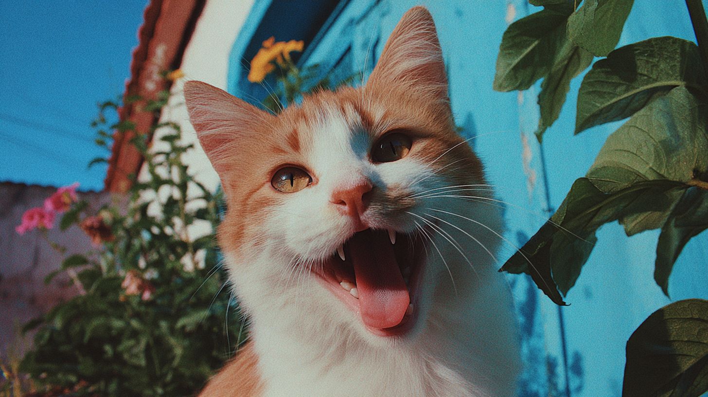 オレンジと白の猫が、ピンクの舌を見せている。大きな目とかわいくて笑っている顔。