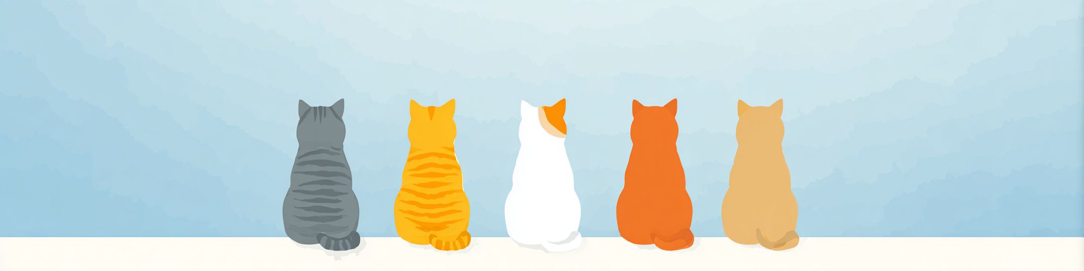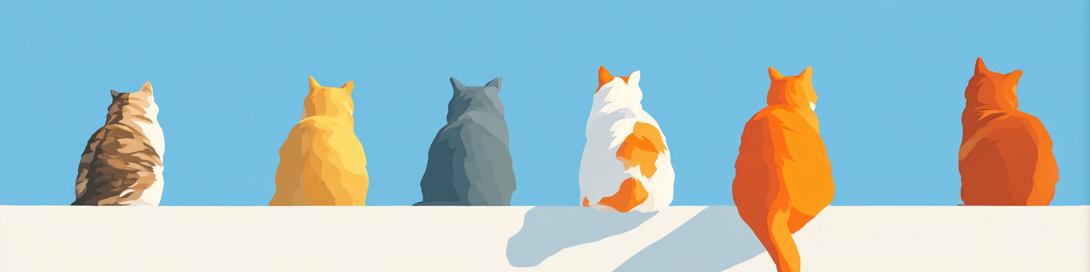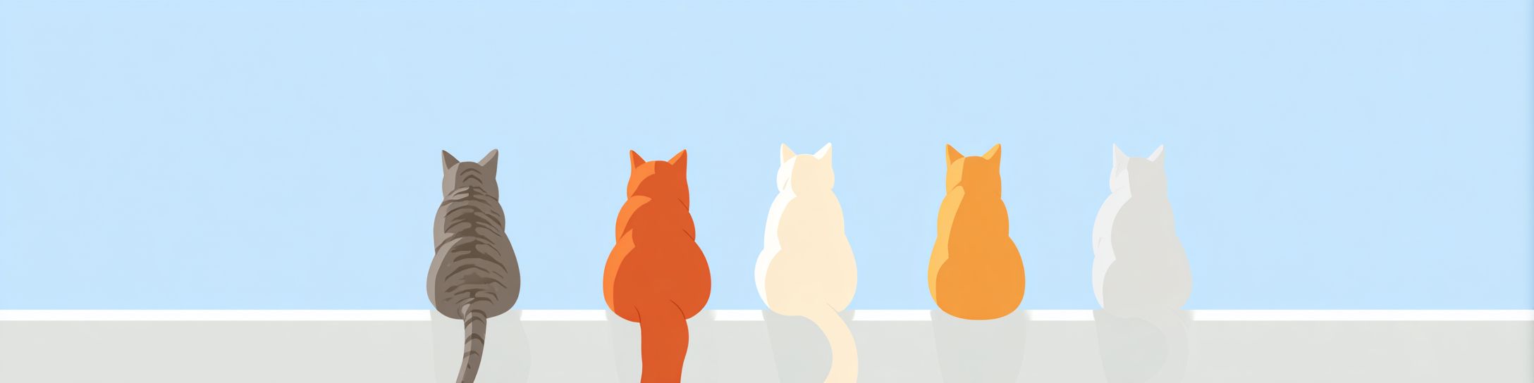 白い壁に座っている五匹の猫のミニマリストイラスト、後ろから見た視点で、完全に整列し、それぞれの猫は異なる色を持っています:タビー、オレンジと白、白、グレー、オレンジ。清潔で柔らかなグラデーションの青空の背景、シンプルなフラットカラーのブロック、毛のテクスチャーがなく、滑らかな形状、アウトラインがない、エレガントなネガティブスペースの構成、穏やかで平和な雰囲気。