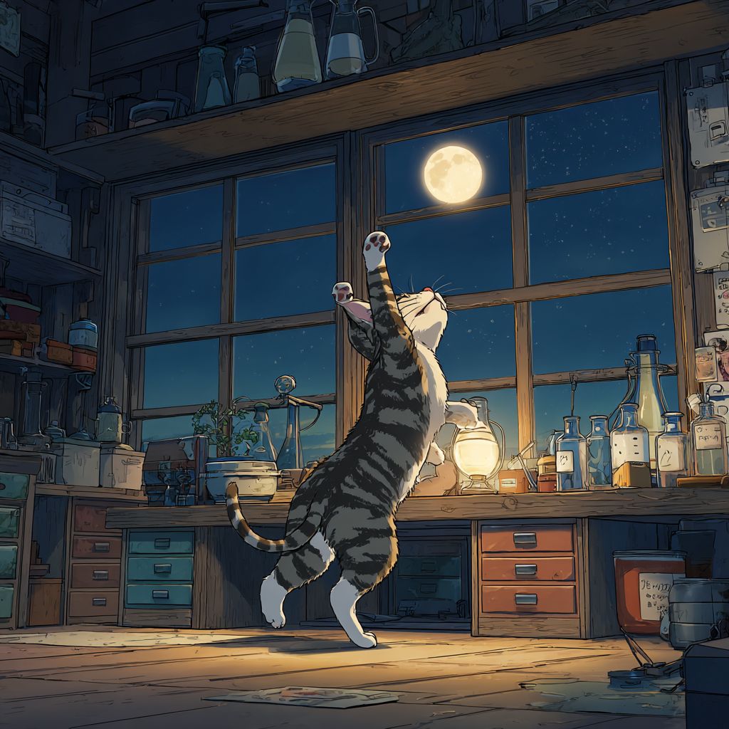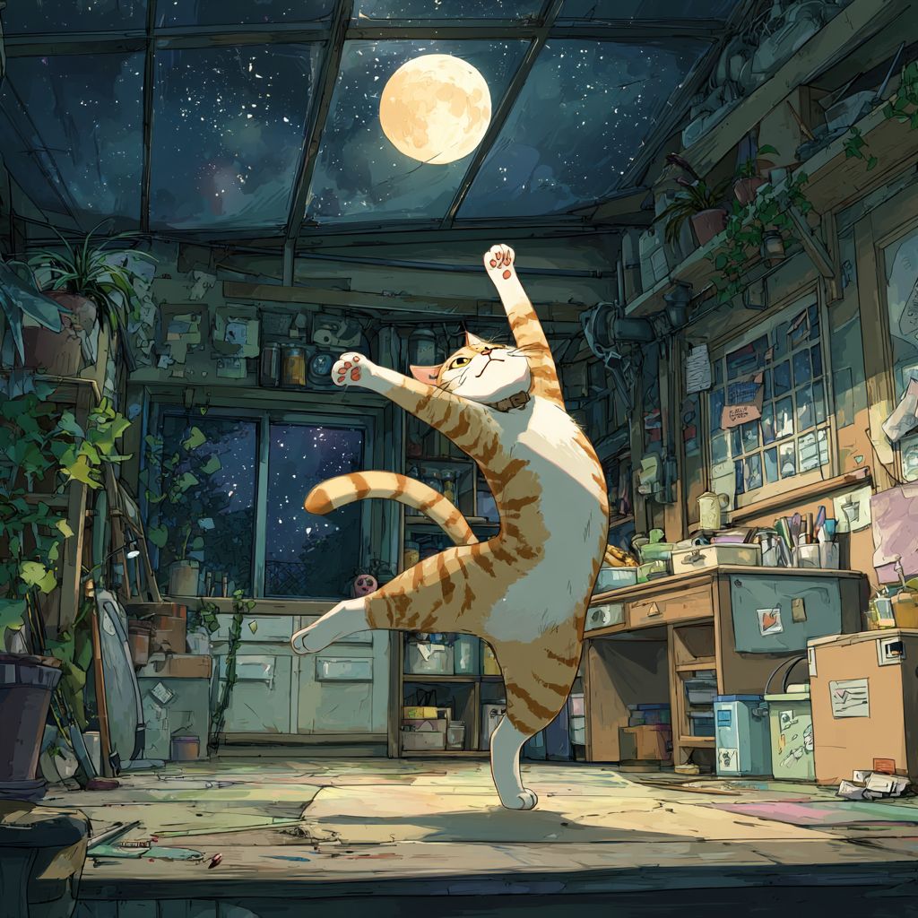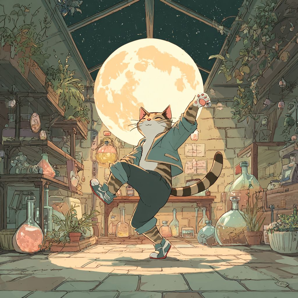 달빛 아래에서 춤추는 얼룩 고양이, 연금술 연구소, 하이큐와 같은 스포츠 애니메이션 스타일, 파스텔 색상, 귀여운 표정, 일상 물품, 느긋한 분위기