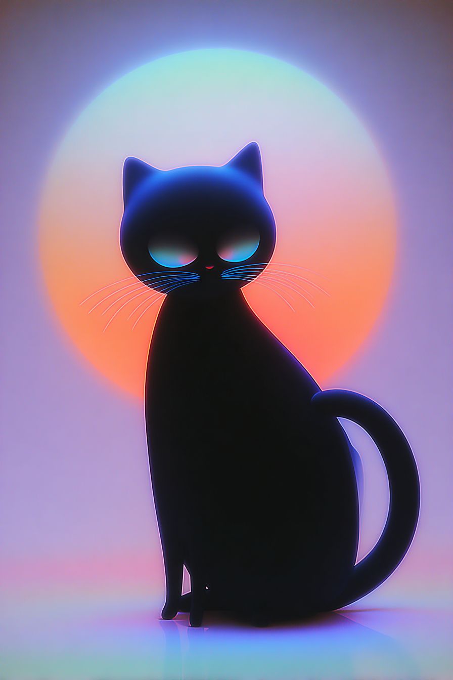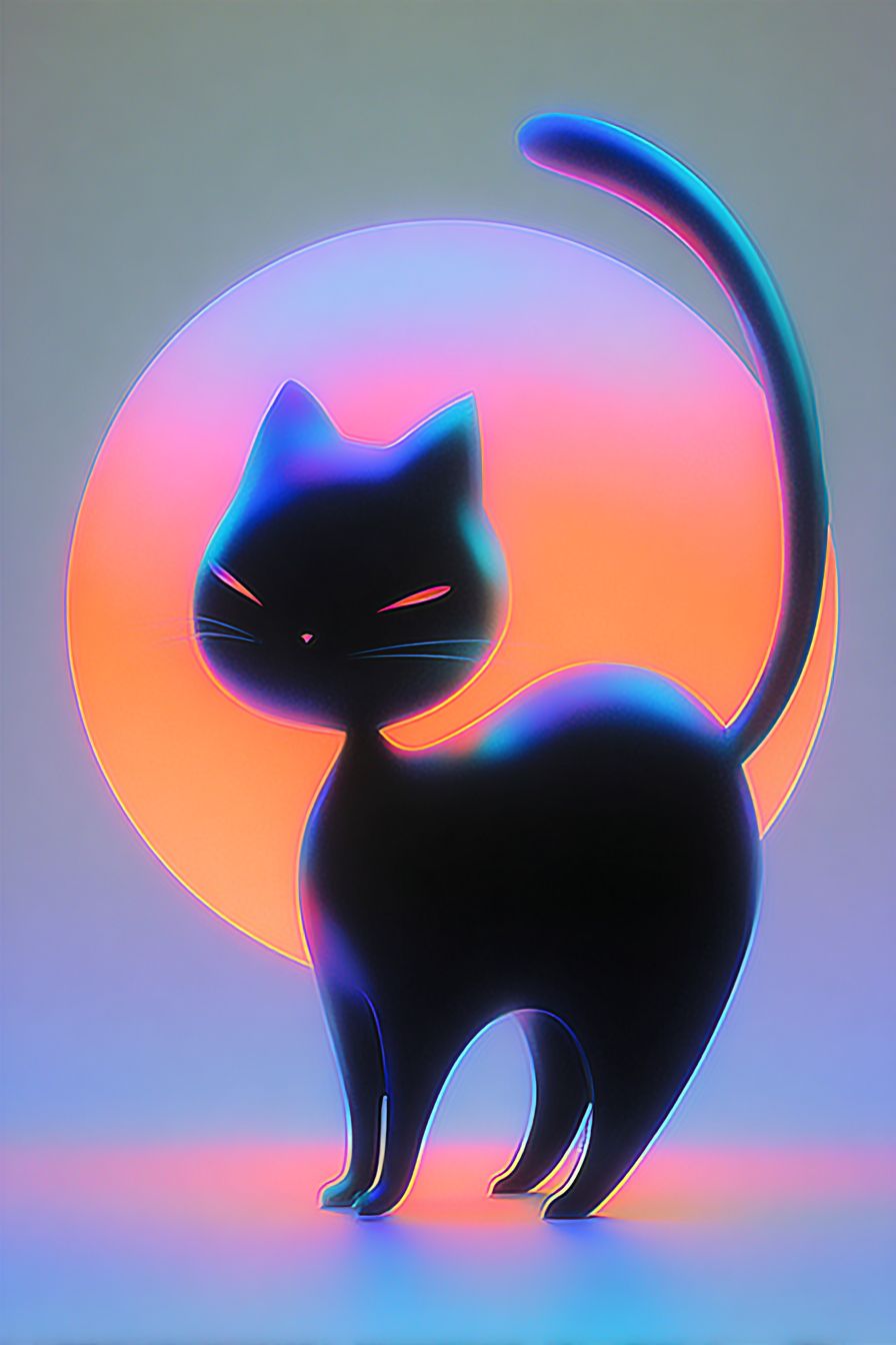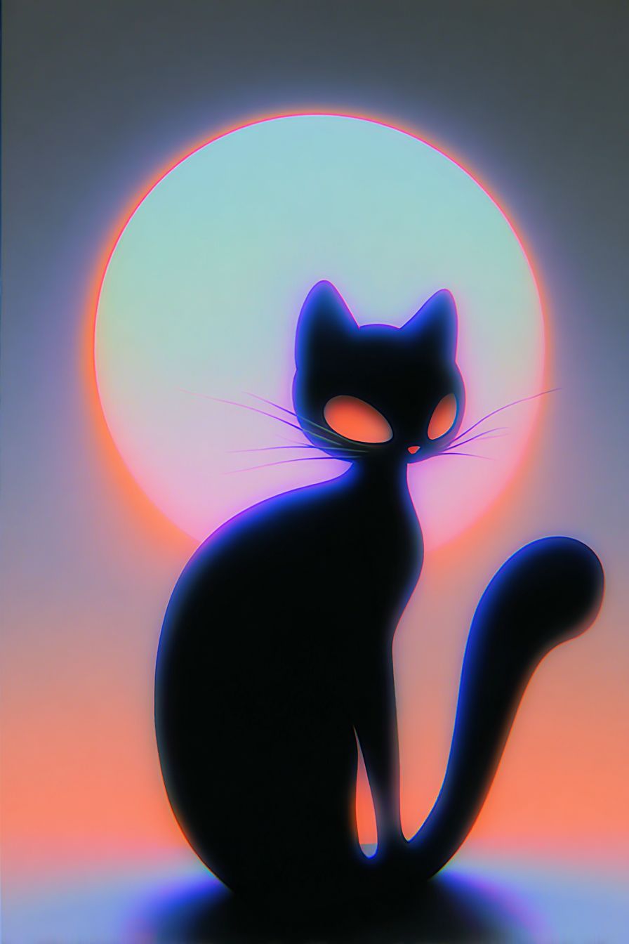 Um elegante gato Bombay preto silhuetado contra a lua cheia, com o rabo balançando misteriosamente