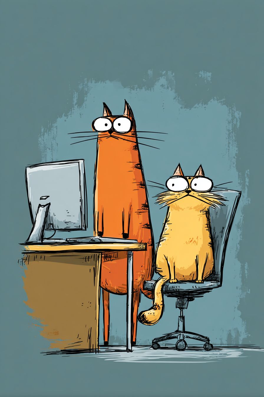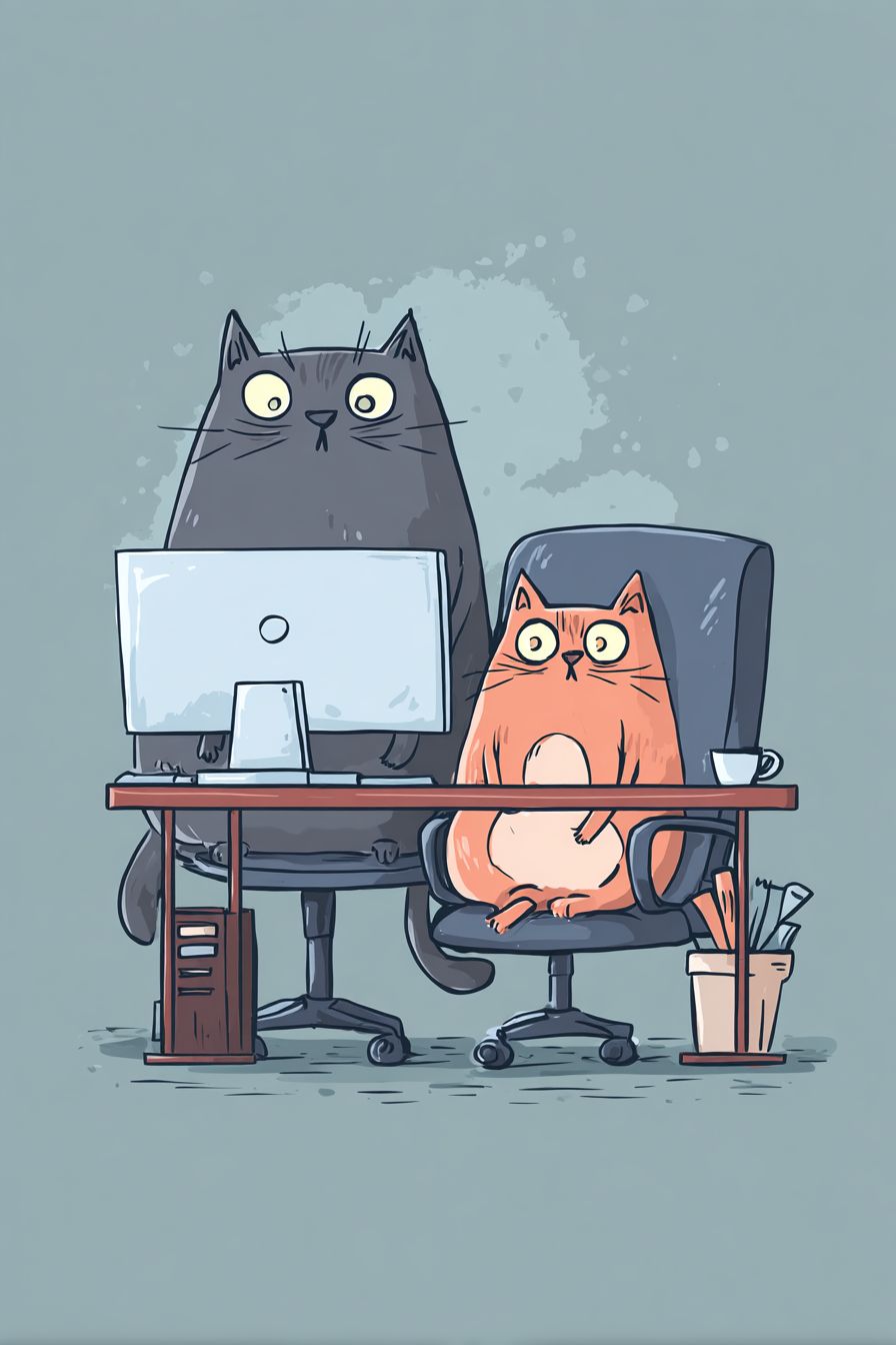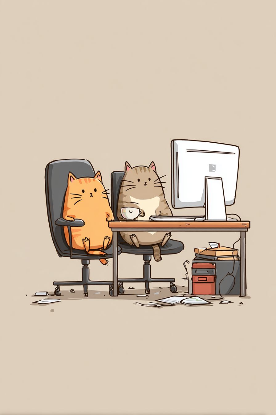 Dois gatos engraçados de escritório, um sentado na cadeira e o outro ao lado, ambos olhando para o monitor do computador