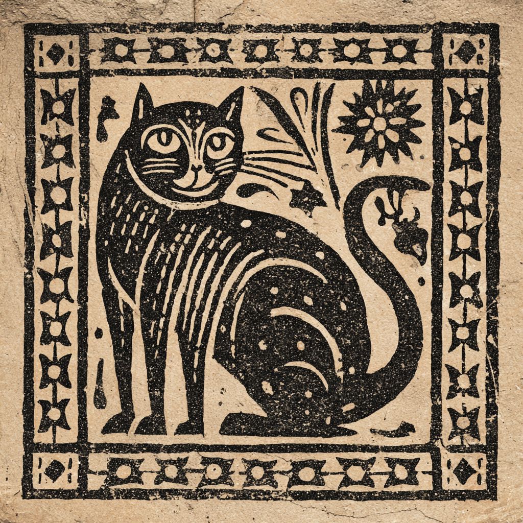 Ilustração de impressão em madeira medieval de um gato, estilo de manuscrito do século XIV, linhas grossas e ásperas, estética medieval ingênua e grotesca, cercada por ornamentos decorativos e motivos florais, estilo de xilogravura religiosa primitiva, não moderna, não abstrata, não expressionista, estilo de ilustração de enciclopédia