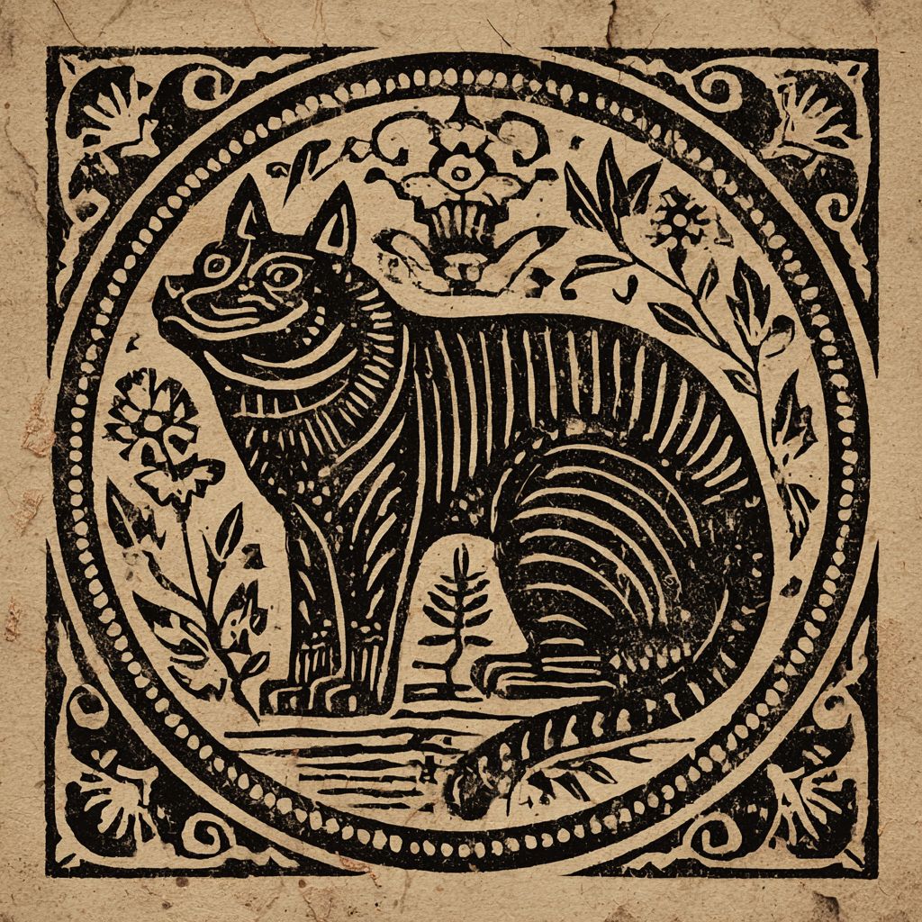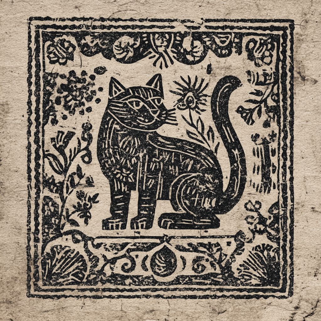 Ilustração de um gato em estilo medieval com linhas grossas e motivos florais decorativos