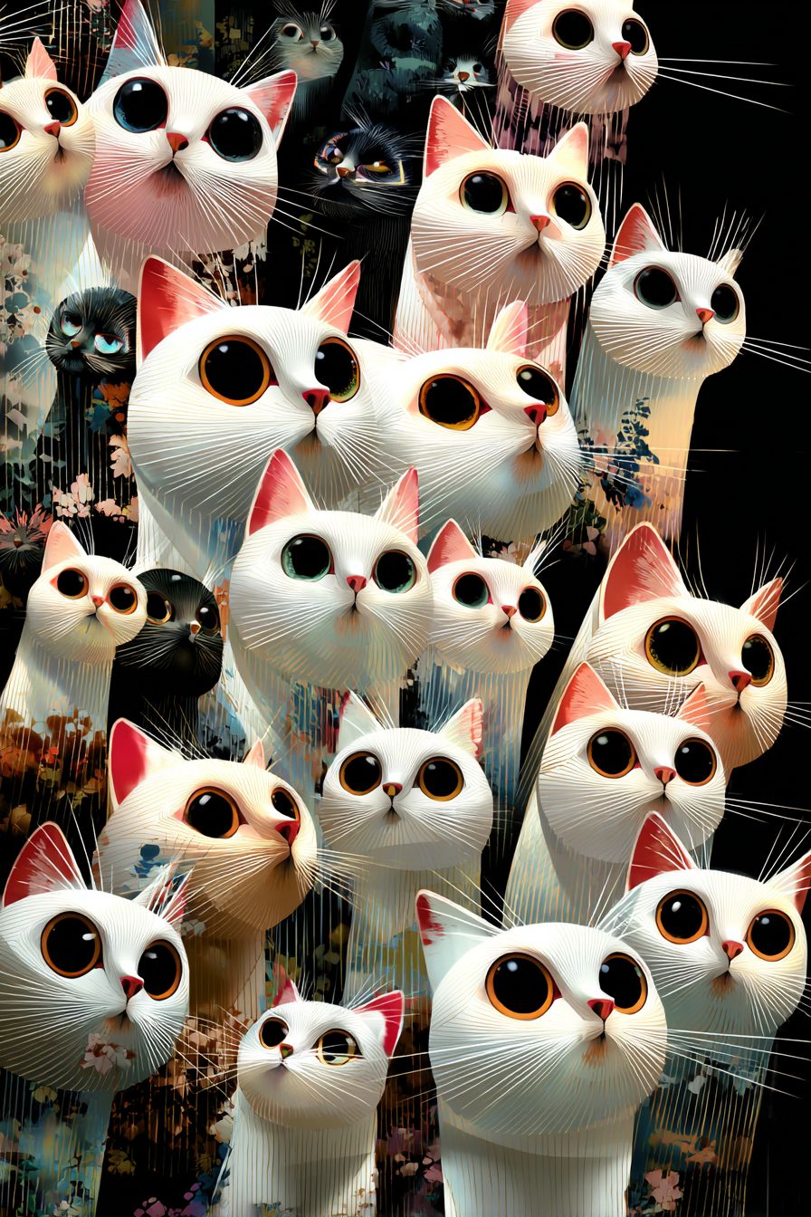 Um grupo de gatos brancos com grandes olhos ilustrado em um estilo de linha simples contra um fundo preto