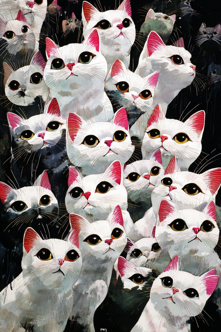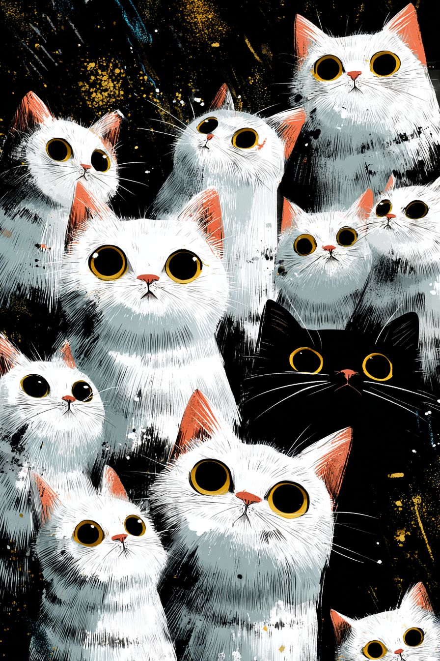 Um grupo de gatos brancos com olhos grandes, pintados no estilo de Wu Guanzhong, usando linhas simples e ilustrações planas em um estilo de tinta, contra um fundo preto.