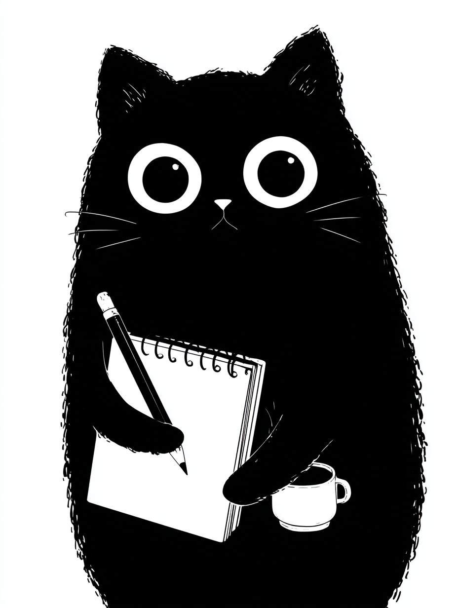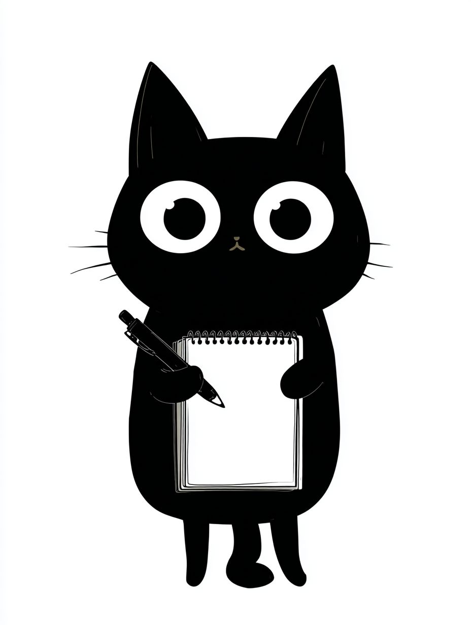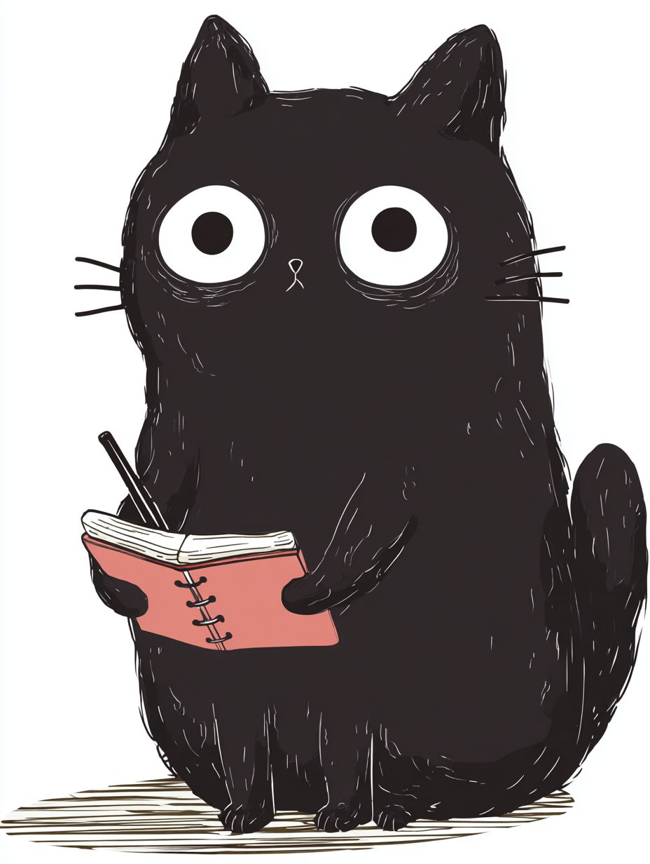 Простое векторное изображение милого kawaii черного кота с большими глазами, пишущего в блокноте.