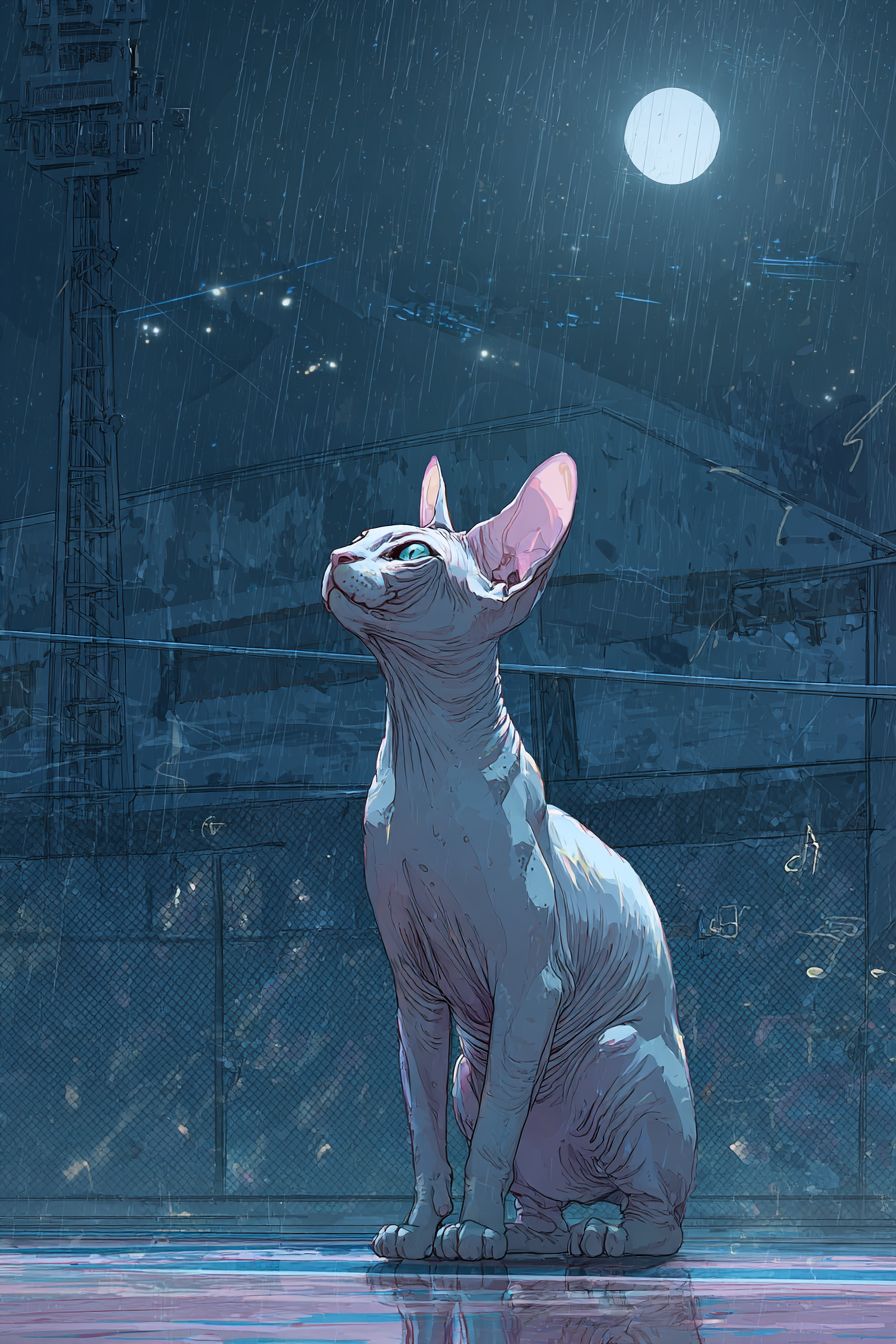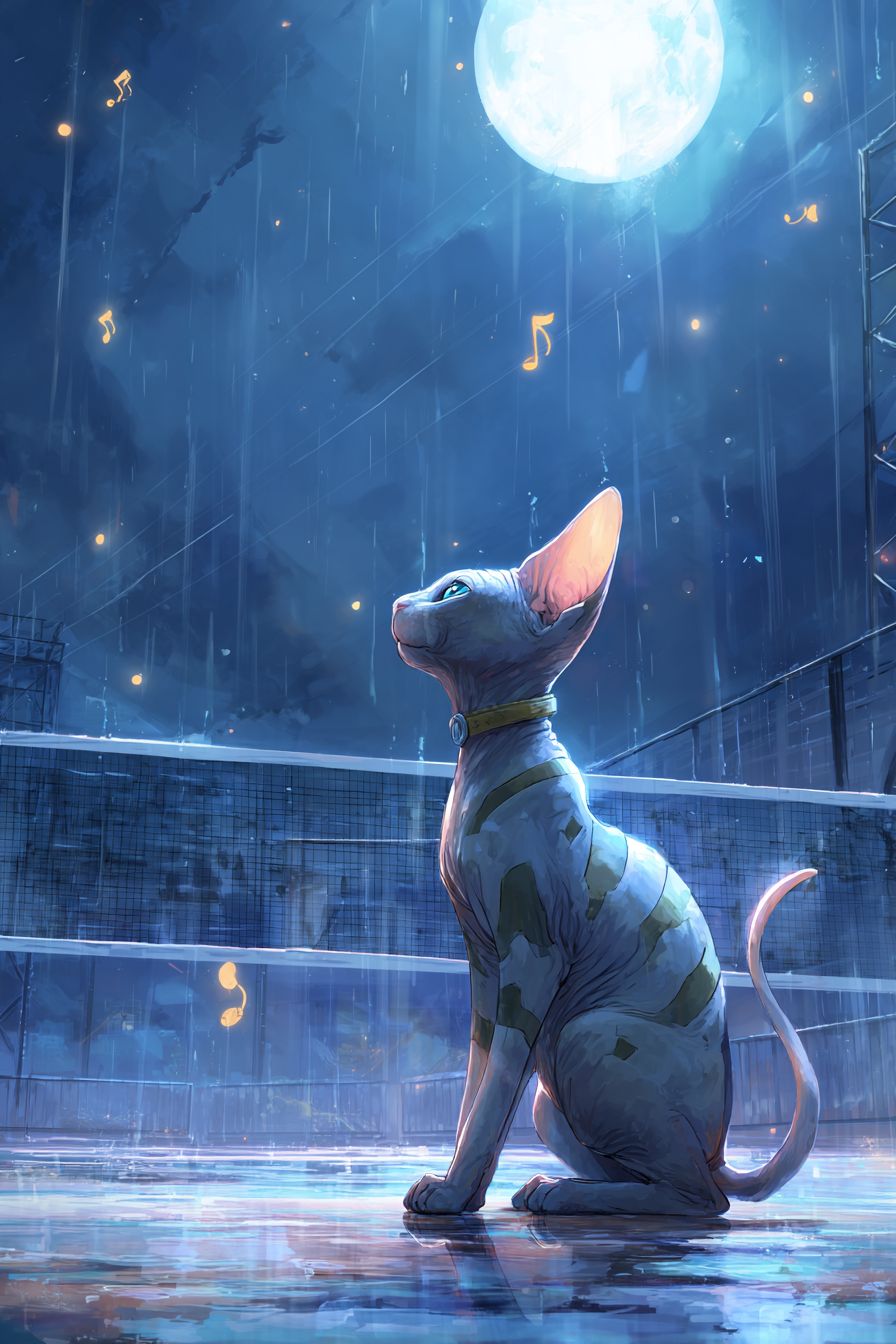 Сфинкс-кошка, танцующая под лунным светом на интенсивном волейбольном корте, в стиле меха-аниме, похожем на Гундама, нежный дождь, эмоциональный крупный план, плавающие музыкальные ноты, трогательные мелодии.