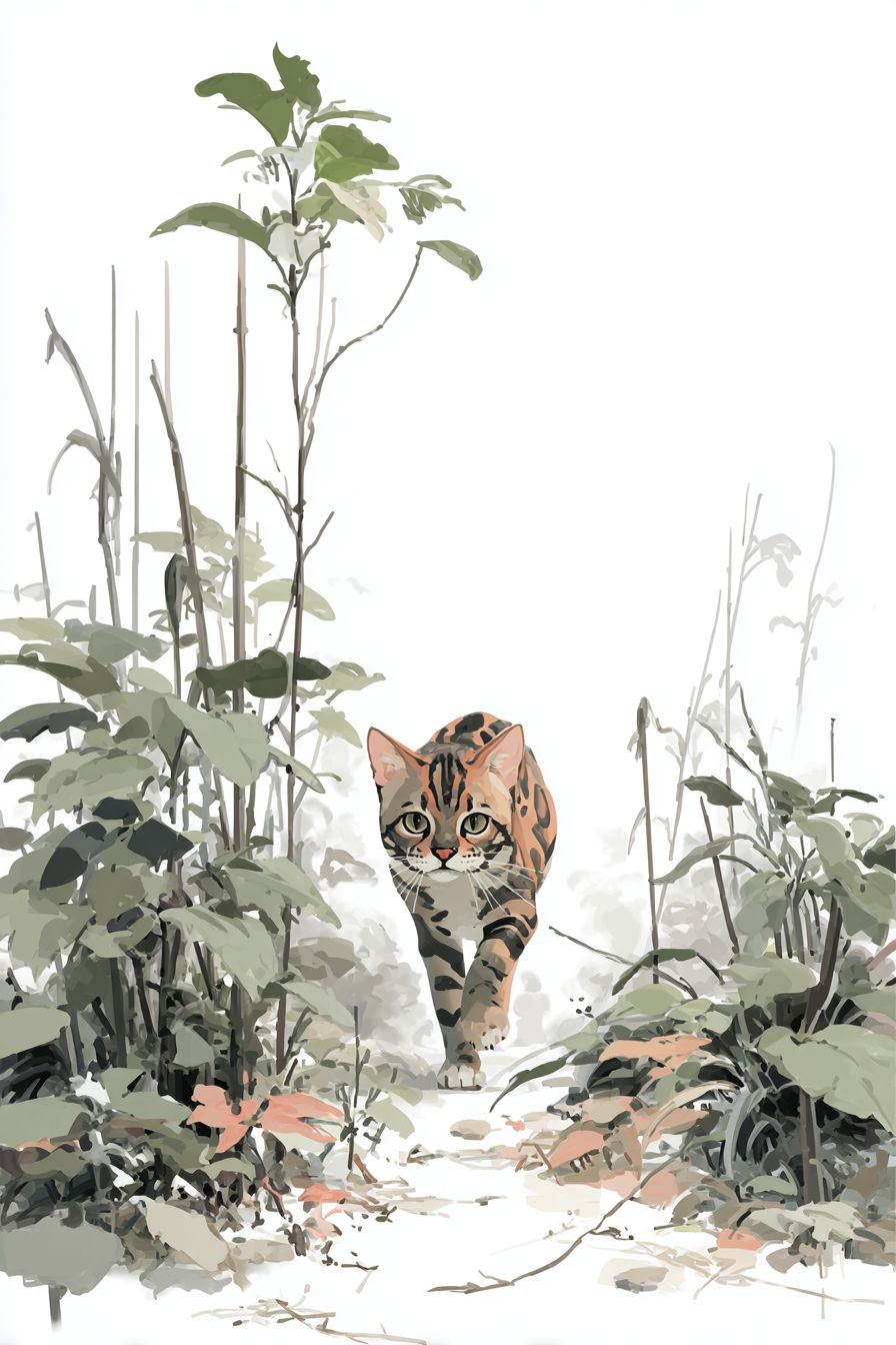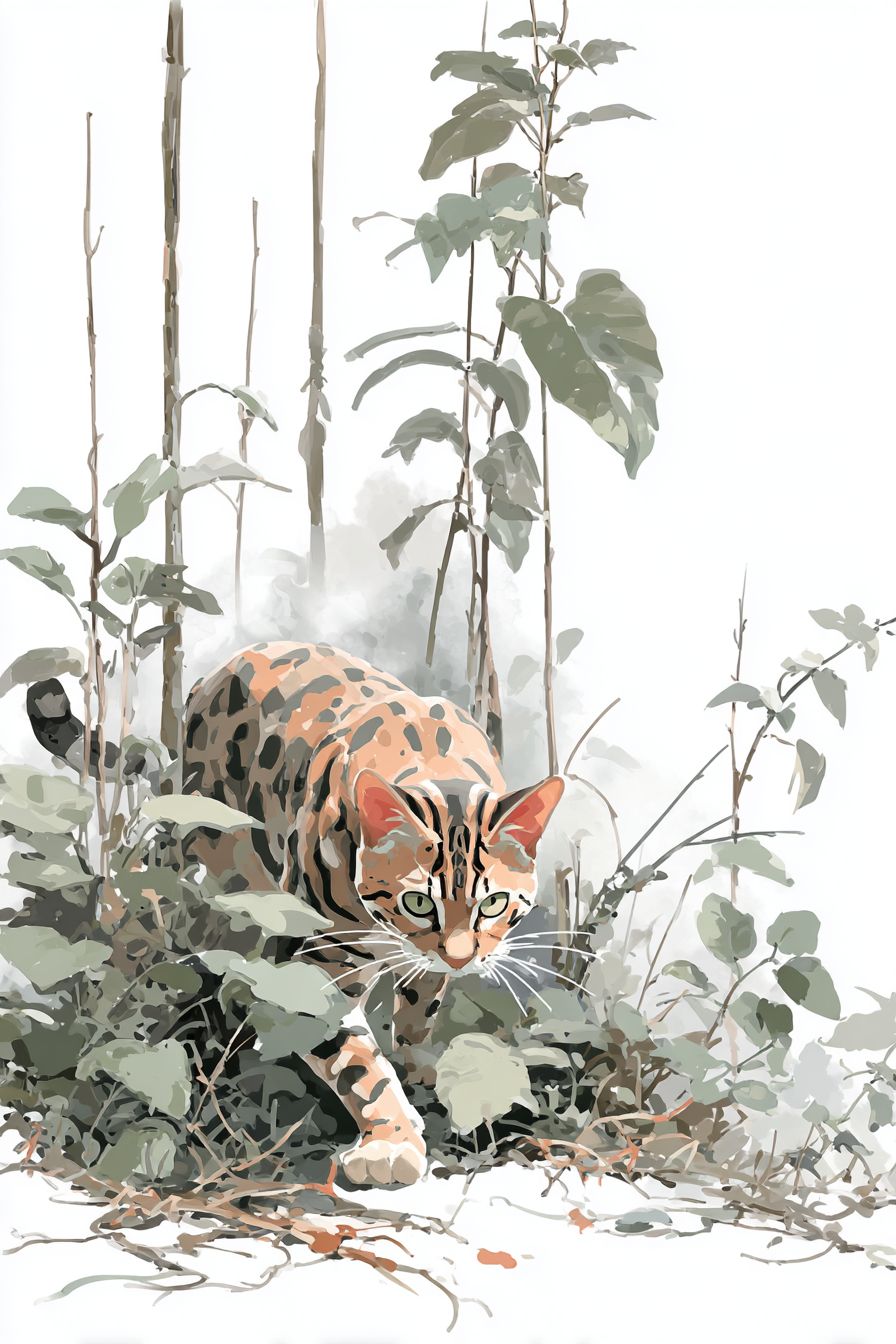 Величественный бенгальский кот крадется сквозь туманный подлесок джунглей, его свирепые глаза сосредоточены на добыче.